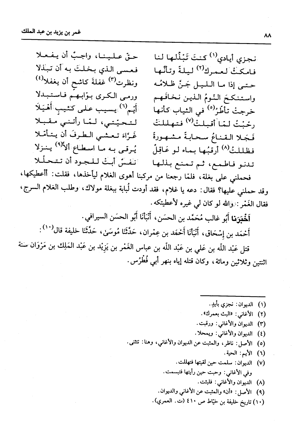 نجزي أيادي (1) كنت تبذلها لنا * حق علينا واجب أن يفعلا فامكث لعمرك (2) ليلة وتأنها * فعسى الذي بخلت به أن تبذلا حتى إذا ما الليل جن ظلامه * ونظرت (3) غفلة كاشح أن يغفلا (4) واستنكح النوم الذين نخافهم * ورمى الكرى بوابهم فاستبدلا خرجت تأطر (5) في الثياب كأنها * أيم (6) يسيب على كثيب أهيلا رحبت لما أقبلت (7) فتهللت * لتحيتي لما رأتني مقبلا فجلا القناع سحابة مشهورة * غراء تعشى الطرف أن يتأملا فظللت (8) أرقبها بماء لو عاقل * يرقى به ما اسطاع ألا (9) ينزلا تدنو فاطمع ثم تمنع بذلها * نفس أبت للجود أن تتحللا * فحملني على بغلة فلما رجعنا من مركبنا أهوى الغلام ليأخذها فقلت أأعطيكها وقد حملني عليها فقال دعه يا غلام فقد أودت لبابة ببغلة مولاك وطلب الغلام السرج فقال الغمر والله لو كان لي غيره لأعطيتكه أخبرنا أبو غالب محمد بن الحسن أنبأنا أبو الحسن السيرافي أحمد بن إسحاق أنبأنا أحمد بن عمران حدثنا موسى حدثنا خليفة قال (10) قتل عبد الله بن علي بن عبد الله بن عباس الغمر بن يزيد بن عبد الملك بن مروان سنة اثنتين وثلاثين ومائة وكان قتله إياه بنهر أبي فطرس "
