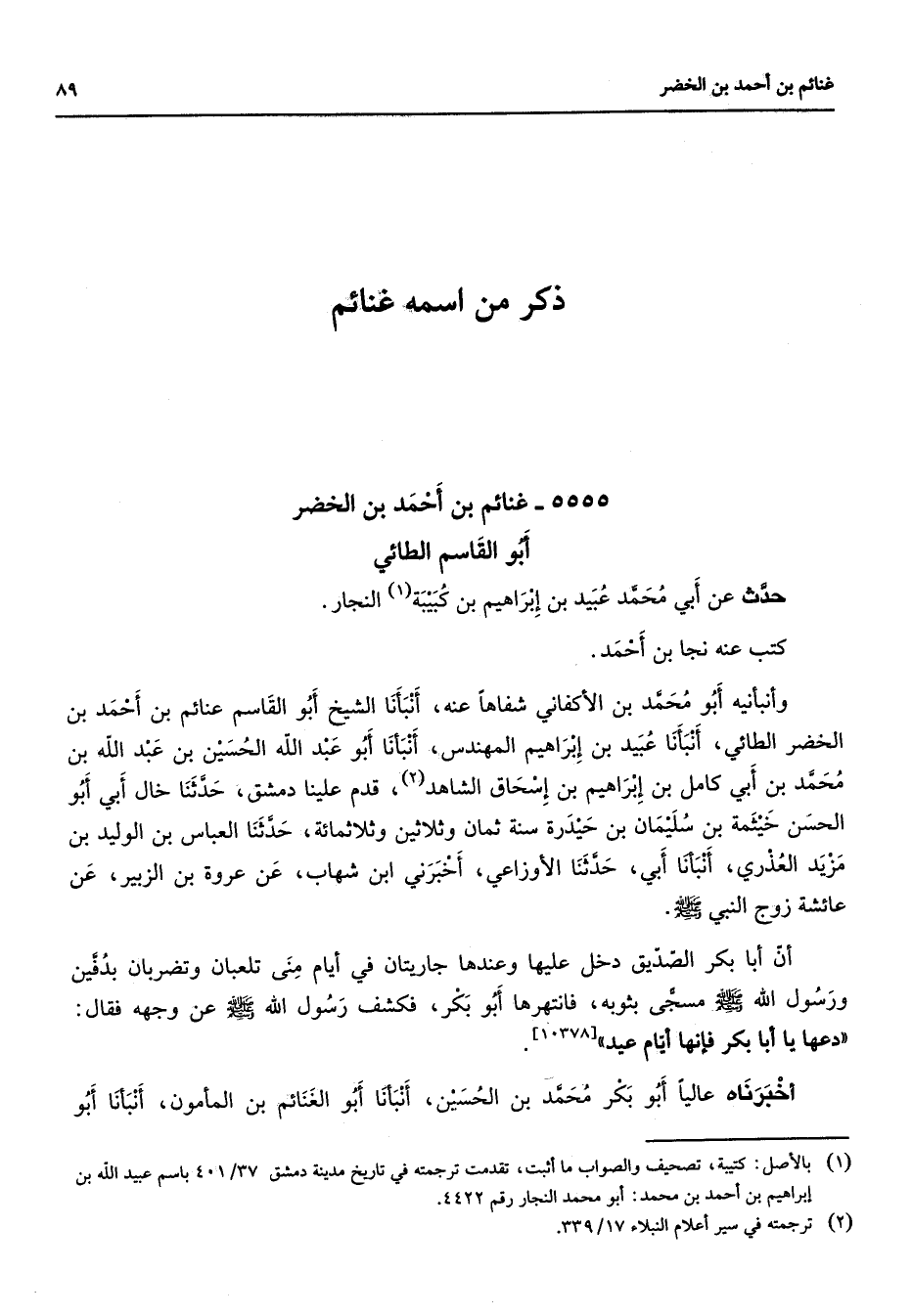 5555 - غنائم بن أحمد بن الخضر أبو القاسم الطائي حدث عن أبي محمد عبيد بن إبراهيم بن كبيبة (1) النجار كتب عنه نجا بن أحمد وأنبأنيه أبو محمد بن الأكفاني شفاها عنه أنبأنا الشيخ أبو القاسم غنائم بن أحمد بن الخضر الطائي أنبأنا عبيد بن إبراهيم المهندس أنبأنا أبو عبد الله الحسين بن عبد الله بن محمد بن أبي كامل بن إبراهيم بن إسحاق الشاهد (2) قدم علينا دمشق حدثنا خال أبي أبو الحسن خيثمة بن سليمان بن حيدرة سنة ثمان وثلاثين وثلاثمائة حدثنا العباس بن الوليد بن مزيد العذري أنبانا أبي حدثنا الأوزاعي أخبرني ابن شهاب عن عروة بن الزبير عن عائشة زوج النبي (صلى الله عليه وسلم) أن أبا بكر الصديق دخل عليها وعندها جاريتان في أيام منى تلعبان وتضربان بدفين ورسول الله (صلى الله عليه وسلم) مسجى بثوبه فانتهرها أبو بكر فكشف رسول الله (صلى الله عليه وسلم) عن وجهه (فقال دعها يا أبا بكر فإنها أيام عيد) أخبرناه عاليا أبو بكر محمد بن الحسين أنبأنا أبو الغنائم بن المأمون أنبأنا أبو