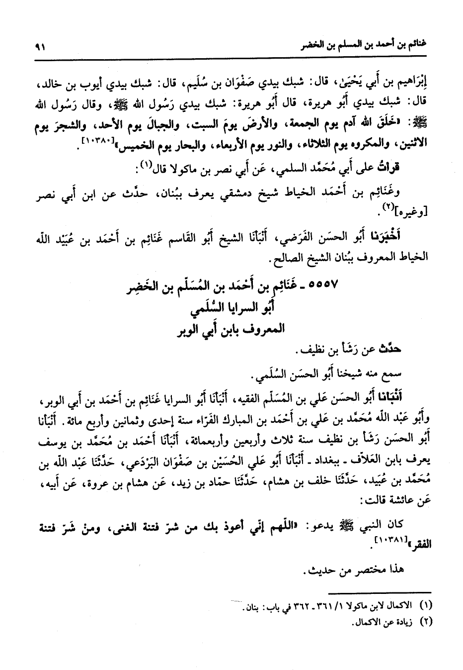 5557 - غنائم بن أحمد بن المسلم بن الخضر أبو السرايا السلمي المعروف بابن أبي الوبر حدث عن رشأ بن نظيف سمع منه شيخنا أبو الحسن السلمي أنبأنا أبو الحسن علي بن المسلم الفقيه أنبأنا أبو السرايا غنائم بن أحمد بن أبي الوبر وأبو عبد الله محمد بن علي بن أحمد بن المبارك الفراء سنة إحدى وثمانين وأربع مائة أنبأنا أبو الحسن رشأ بن نظيف سنة ثلاث وأربعين وأربعمائة أنبأنا أحمد بن محمد بن يوسف يعرف بابن العلاف ببغداد أنبأنا أبو علي الحسين بن صفوان البردعي حدثنا عبد الله بن محمد بن عبيد حدثنا خلف بن هشام حدثنا حماد بن زيد عن هشام بن عروة عن أبيه عن عائشة قالت كان النبي (صلى الله عليه وسلم) يدعو ((اللهم إني أعوذ بك من شر فتنة الغنى ومن شر فتنة الفقر) هذا مختصر من حديث