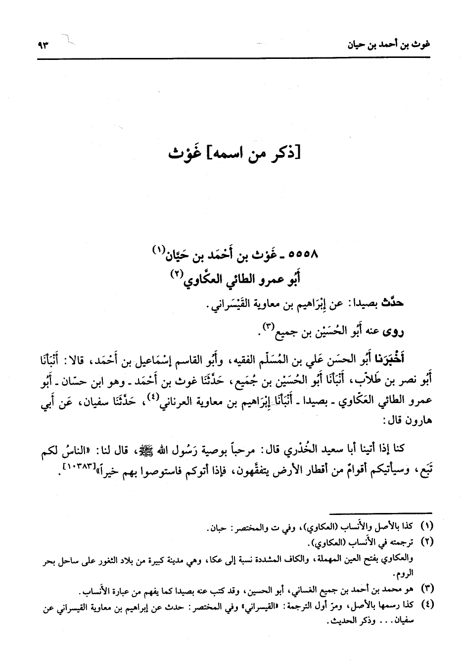 5558 - غوث بن أحمد بن حيان (1) أبو عمرو الطائي العكاوي (2) حدث بصيدا عن إبراهيم بن معاوية القيسراني روى عنه أبو الحسين بن جميع (3) أخبرنا أبو الحسن علي بن المسلم الفقيه وأبو القاسم إسماعيل بن أحمد قالا أنبأنا أبو نصر بن طلاب أنبأنا أبو الحسين بن جميع حدثنا غوث بن أحمد وهو ابن حسان أبو عمرو الطائي العكاوي بصيدا أنبأنا إبراهيم بن معاوية العرناني (4) حدثنا سفيان عن أبي هارون قال كنا إذا أتينا أبا سعيد الخدري قال مرحبا بوصية رسول الله (صلى الله عليه وسلم) قال لنا (الناس لكم تبع وسيأتيكم أقوام من أقطار الأرض يتفقهون فإذا أتوكم فاستوصوا بهم خيرا)