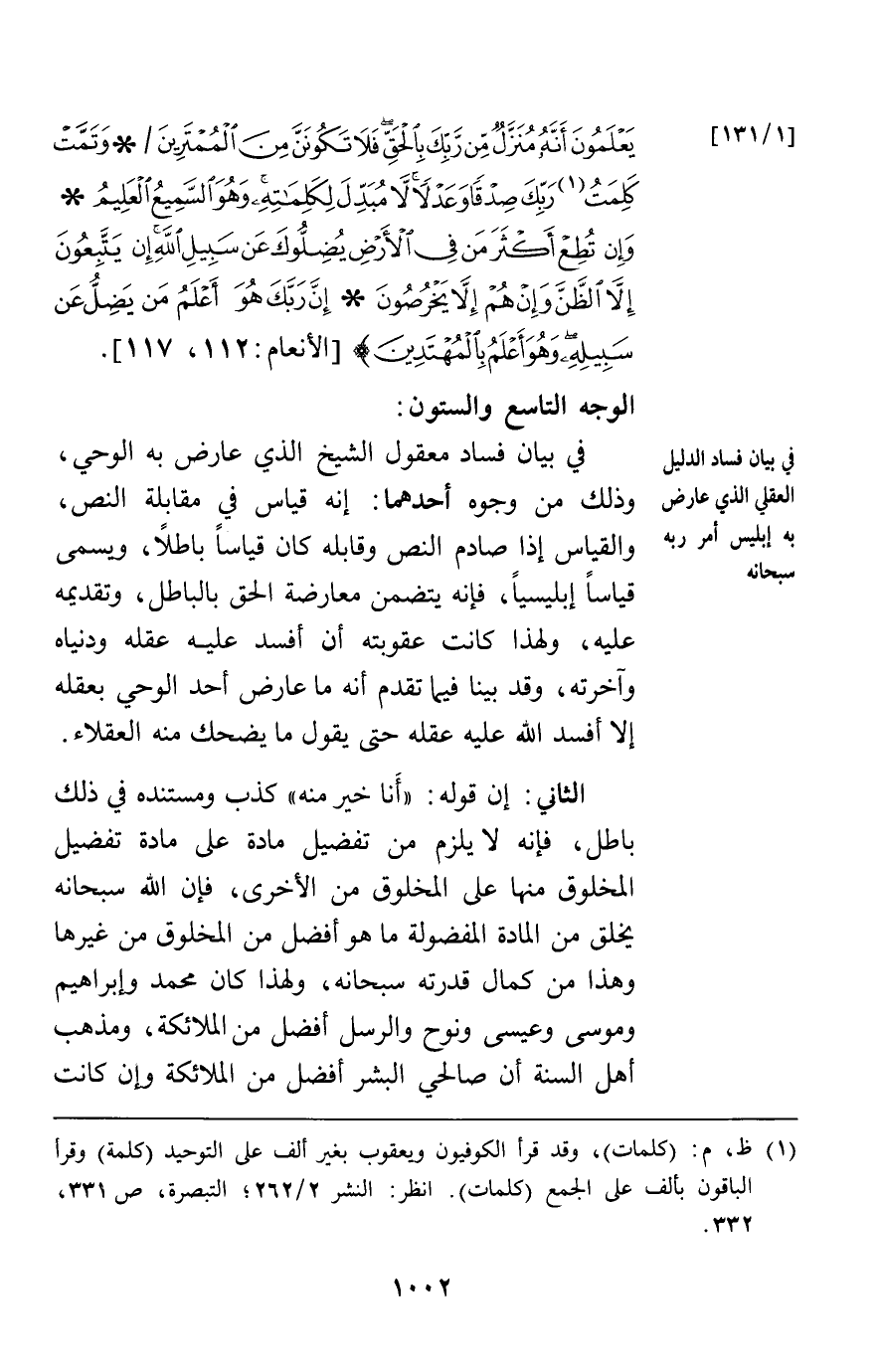 الوجه التاسع والستون: في بيان فساد معقول الشيخ الذي عارض به الوحي وذلك من وجوه: أحدها إنه قياس في مقابلة النص والقياس إذا صادم النص وقابله كان قياسا باطلا ويسمى قياسا إبليسيا فإنه يتضمن معارضة الحق بالباطل وتقديمه عليه ولهذا كانت عقوبته أن أفسد عليه عقله ودنياه وآخرته وقد بينا فيما تقدم أنه ما عارض أحد الوحي بعقله إلا أفسد الله عليه عقله حتى يقول ما يضحك منه العقلاء.