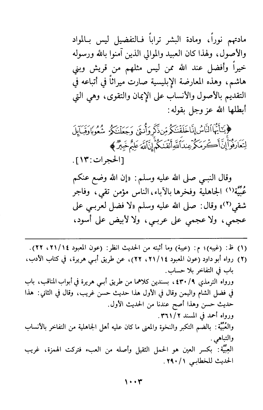 وقال النبي صلى الله عليه وسلم: "إن الله وضع عنكم عبية الجاهلية وفخرها بالآباء الناس مؤمن تقي وفاجر شقي" وقال صلى الله عليه وسلم: "لا فضل لعربي على عجمي ولا عجمي على عربي ولا لأبيض على أسود