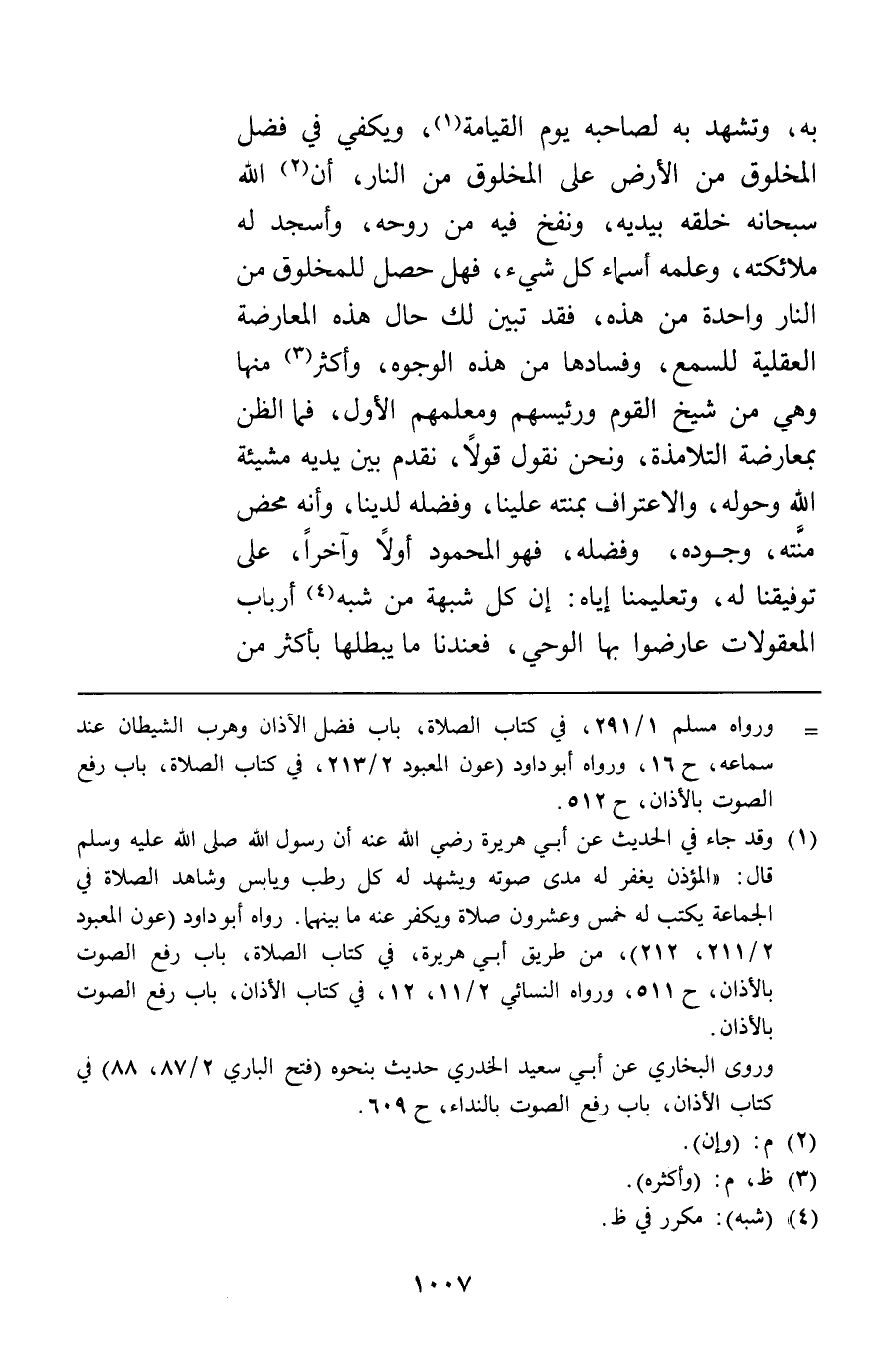به وتشهد به لصاحبه يوم القيامة ويكفي في فضل المخلوق من الأرض على المخلوق من النار أن الله سبحانه خلقه بيديه ونفخ فيه من روحه وأسجد له ملائكته وعلمه أسماء كل شيء فهل حصل للمخلوق من النار واحدة من هذه فقد تبين لك حال هذه المعارضة العقلية للسمع وفسادها من هذه الوجوه وأكثر منها وهي من شيخ القوم ورئيسهم ومعلمهم الأول فما الظن بمعارضة التلامذة ونحن نقول قولا نقدم بين يديه مشيئة الله وحوله والاعتراف بمنته علينا وفضله لدينا وأنه محض منته وجوده وفضله فهو المحمود أولا وآخرا على توفيقنا له وتعليمنا إياه إن كل شبهة من شبه أرباب المعقولات عارضوا بها الوحي فعندنا ما يبطلها بأكثر من