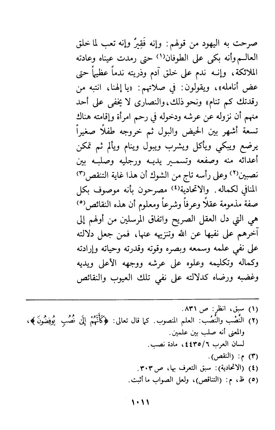 صرحت به اليهود من قولهم وإنه فقير وإنه تعب لما خلق العالم وأنه بكى على الطوفان حتى رمدت عيناه وعادته الملائكة وإنه ندم على خلق آدم وذريته ندما عظيما حتى عض أنامله ويقولون في صلاتهم يا إلهنا انتبه من رقدتك كم تنام ونحو ذلك والنصارى لا يخفى على أحد منهم أن نزوله عن عرشه ودخوله في رحم امرأة وإقامته هناك تسعة أشهر بين الحيض والبول ثم خروجه طفلا صغيرا يرضع ويبكي ويأكل ويشرب ويبول وينام ويألم ثم تمكن أعدائه منه وصفعه وتسمير يديه ورجليه وصلبه بين نصبين وعلى رأسه تاج من الشوك أن هذا غاية التنقص المنافي لكماله والاتحادية مصرحون بأنه موصوف بكل صفة مذمومة عقلا وعرفا وشرعا ومعلوم أن هذه النقائص هي التي دل العقل الصريح واتفاق المرسلين من أولهم إلى آخرهم على نفيها عن الله وتنزيهه عنها فمن جعل دلالته على نفي علمه وسمعه وبصره وقوته وقدرته وحياته وإرادته وكماله وتكليمه وعلوه على عرشه ووجهه الأعلى ويديه وغضبه ورضاه كدلالته على نفي تلك العيوب والنقائص