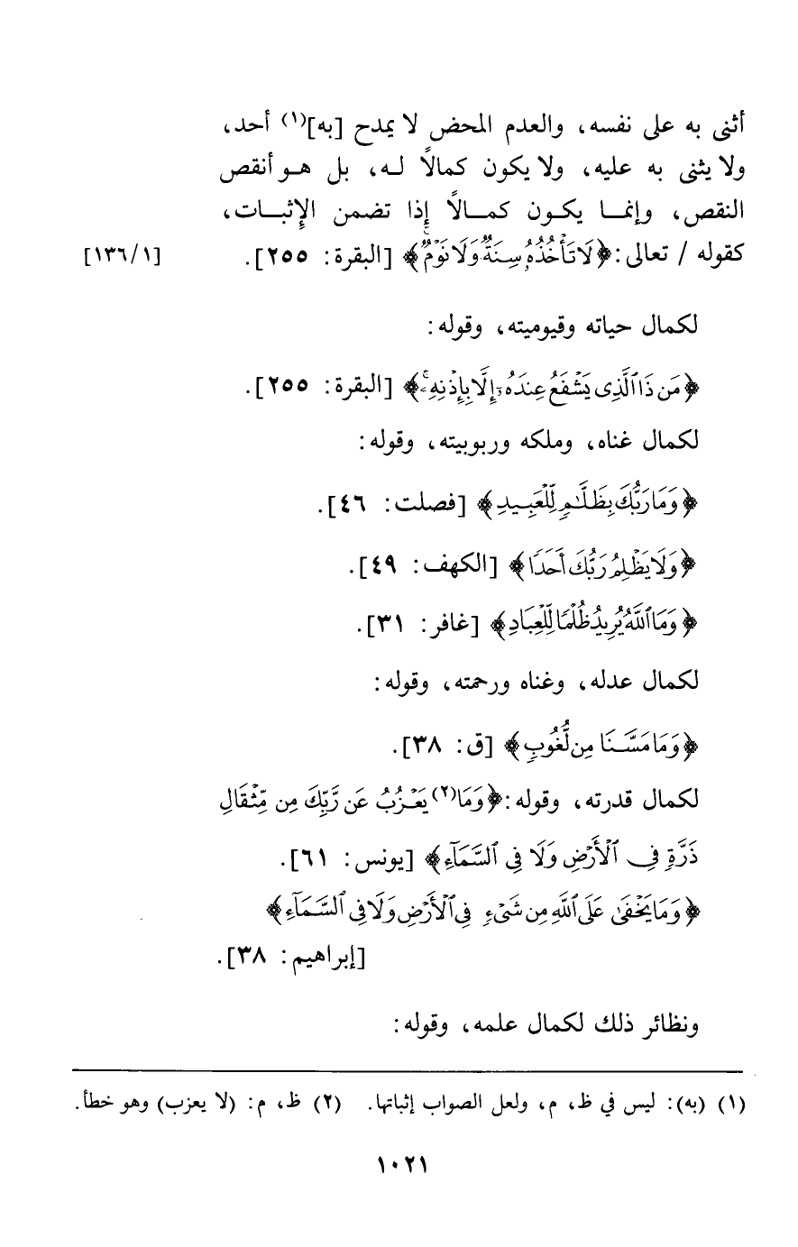 لكمال حياته وقيوميته وقوله {مَنْ ذَا الَّذِي يَشْفَعُ عِنْدَهُ إِلاَّ بِإِذْنِهِ} [البقرة255] لكما غناه وملكه وربوبيته وقوله {وَمَا رَبُّكَ بِظَلَّامٍ لِلْعَبِيدِ} [فصلت46] {وَلا يَظْلِمُ رَبُّكَ أَحَداً} [الكهف49] {وَمَا اللَّهُ يُرِيدُ ظُلْماً لِلْعِبَادِ} [غافر31] لكمال عدله وغناه ورحمته وقوله {وَمَا مَسَّنَا مِنْ لُغُوبٍ} [ق38] لكمال قدرته وقوله {وَمَا يَعْزُبُ عَنْ رَبِّكَ مِنْ مِثْقَالِ ذَرَّةٍ فِي الأَرْضِ وَلا فِي السَّمَاءِ} [يونس61] {وَمَا يَخْفَى عَلَى اللَّهِ مِنْ شَيْءٍ فِي الأَرْضِ وَلا فِي السَّمَاءِ} [إبراهيم38] ونظائر ذلك لكمال علمه وقوله