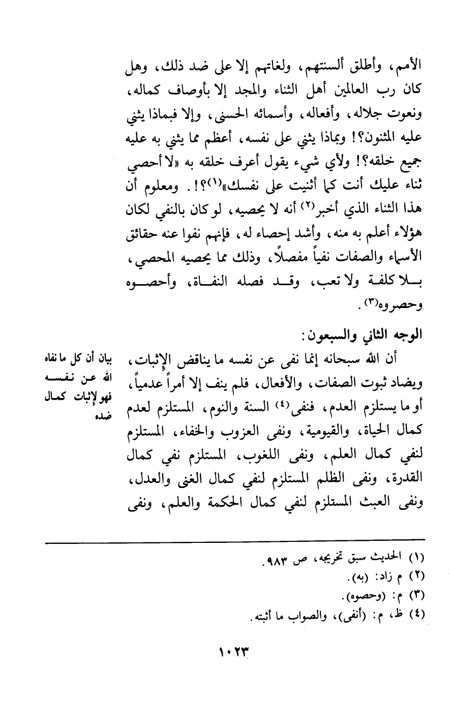 الوجه الثاني والسبعون: أن الله سبحانه إنما نفى عن نفسه ما يناقض الإثبات ويضاد ثبوت الصفات والأفعال فلم ينف إلا أمرا عدميا أو ما يستلزم العدم فنفى السنة والنوم المستلزم لعدم كمال الحياة والقيومية ونفى العزوب والخفاء المستلزم لنفي كمال العلم ونفي اللغوب المستلزم نفي كمال القدرة ونفي الظلم المستلزم لنفي كمال الغنى والعدل ونفي العبث المستلزم لنفي كمال الحكمة والعلم ونفي