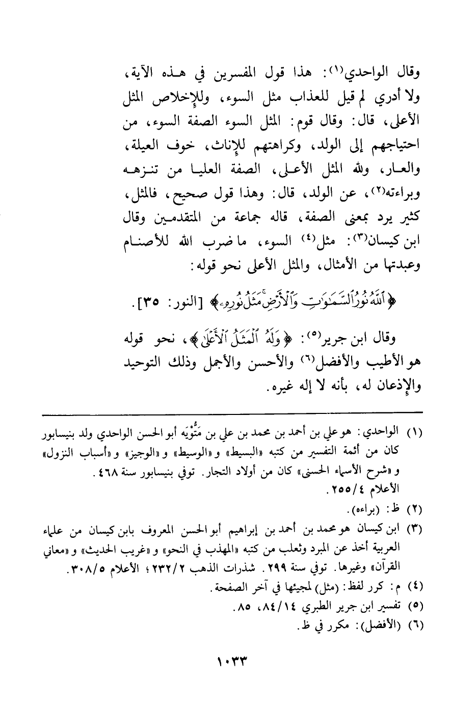 وقال الواحدي هذا قول المفسرين في هذه الآية ولا أدري لم قيل للعذاب مثل السوء وللإخلاص المثل الأعلى قال وقال قوم المثل السوء الصفة السوء من احتياجهم إلى الولد وكراهتهم للإناث خوف العيلة والعار ولله المثل الأعلى الصفة العليا من تنزهه وبراءته عن الولد قال وهذا قول صحيح فالمثل كثيرا ما يرد بمعنى الصفة قاله جماعة من المتقدمين وقال ابن كيسان مثل السوء ما ضرب الله للأصنام وعبدتها من الأمثال والمثل الأعلى نحو قوله {اللَّهُ نُورُ السَّمَاوَاتِ وَالأَرْضِ مَثَلُ نُورِهِ} [النور35] وقال ابن جرير {وَلَهُ الْمَثَلُ الْأَعْلَى} نحو قوله هو الأطيب والأفضل والأحسن والأجمل وذلك التوحيد والإذعان له بأنه لا إله غيره.