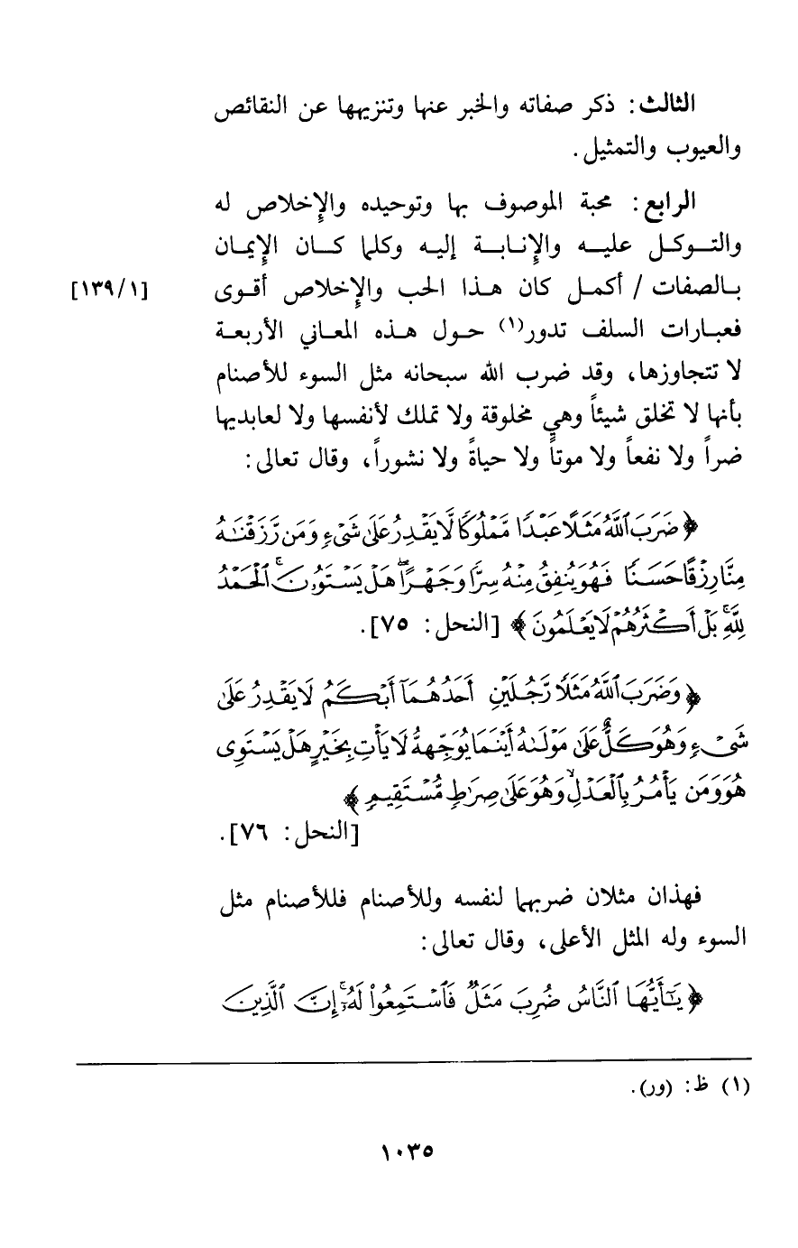الرابع: محبة الموصوف بها وتوحيده والإخلاص له والتوكل عليه والإنابة إليه وكلما كان الإيمان بالصفات أكمل كان هذا الحب والإخلاص أقوى فعبارات السلف تدور حول هذه المعاني الأربعة لا تتجاوزها وقد ضرب الله سبحانه مثل السوء للأصنام بأنها لا تخلق شيئا وهي مخلوقة ولا تملك لأنفسها ولا لعابديها ضرا ولا نفعا ولا موتا ولا حياة ولا نشورا وقال تعالى: {ضَرَبَ اللَّهُ مَثَلاً عَبْداً مَمْلُوكاً لا يَقْدِرُ عَلَى شَيْءٍ وَمَنْ رَزَقْنَاهُ مِنَّا رِزْقاً حَسَناً فَهُوَ يُنْفِقُ مِنْهُ سِرّاً وَجَهْراً هَلْ يَسْتَوُونَ الْحَمْدُ لِلَّهِ بَلْ أَكْثَرُهُمْ لا يَعْلَمُونَ} [النحل75] . {وَضَرَبَ اللَّهُ مَثَلاً رَجُلَيْنِ أَحَدُهُمَا أَبْكَمُ لا يَقْدِرُ عَلَى شَيْءٍ وَهُوَ كَلٌّ عَلَى مَوْلاهُ أَيْنَمَا يُوَجِّهْهُ لا يَأْتِ بِخَيْرٍ هَلْ يَسْتَوِي هُوَ وَمَنْ يَأْمُرُ بِالْعَدْلِ وَهُوَ عَلَى صِرَاطٍ مُسْتَقِيمٍ} [النحل76] .