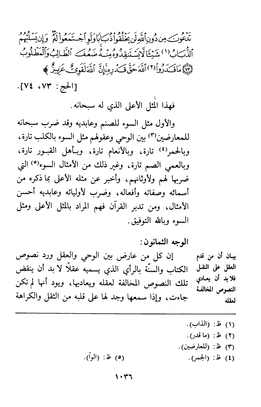 الوجه الثمانون: إن كل من عارض بين الوحي والعقل ورد نصوص الكتاب والسنة بالرأي الذي يسميه عقلا لا بد أن ينقض تلك النصوص المخالفة لعقله ويعاديها ويود أنها لم تكن جاءت وإذا سمعها وجد لها على قلبه من الثقل والكراهة