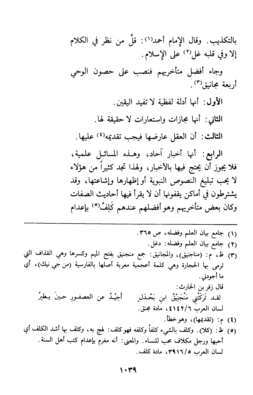 الرابع: أنها أخبار آحاد وهذه المسائل علمية فلا يجوز أن يحتج فيها بالأخبار ولهذا تجد كثيرا من هؤلاء لا يحب تبليغ النصوص النبوية أو إظهارها وإشاعتها وقد يشترطون في أماكن يقفونها أن لا يقرأ فيها أحاديث الصفات وكان بعض متأخريهم وهو أفضلهم عندهم كلف بإعدام