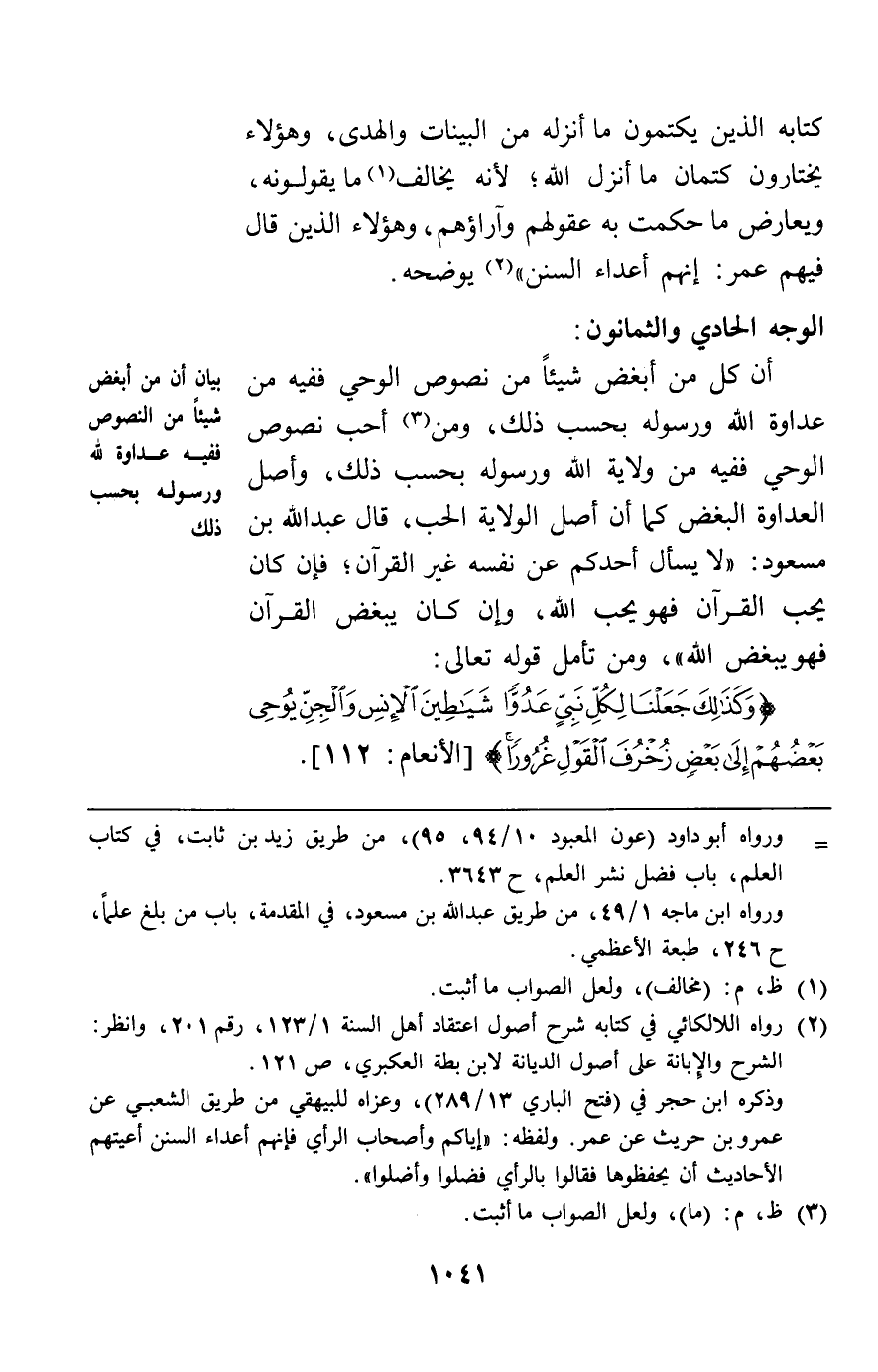 الوجه الحادي والثمانون: أن كل من أبغض شيئا من نصوص الوحي ففيه من عداوة الله ورسوله بحسب ذلك ومن أحب نصوص الوحي ففيه من ولاية الله ورسوله بحسب ذلك وأصل العداوة والبغض كما أن أصل الولاية الحب قال عبد الله بن مسعود لا يسأل أحدكم عن نفسه غير القرآن فإن كان يحب القرآن فهو يحب الله وإن كان يبغض القرآن فهو يبغض الله ومن تأمل قوله تعالى: {وَكَذَلِكَ جَعَلْنَا لِكُلِّ نَبِيٍّ عَدُوّاً شَيَاطِينَ الْأِنْسِ وَالْجِنِّ يُوحِي بَعْضُهُمْ إِلَى بَعْضٍ زُخْرُفَ الْقَوْلِ غُرُوراً} [الأنعام112] .