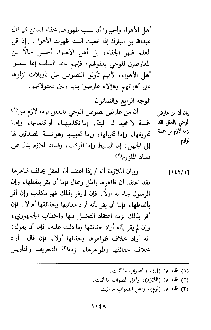 الوجه الرابع والثمانون: أن من عارض نصوص الوحي بالعقل لزمه لازم من خمسة لا محيد له البتة إما تكذيبها أو كتمانها وإما تحريفها وإما تخييلها وإما تجهيلها وهو نسبة المصدقين لها إلى الجهل إما البسيط وإما المركب وفساد اللازم يدل على فساد الملزوم.
