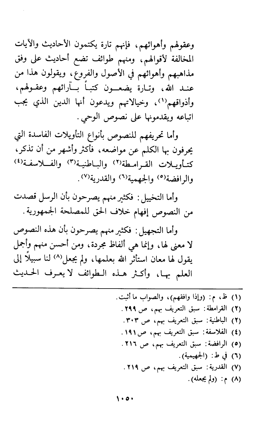 وأما تحريفهم للنصوص بأنواع التأويلات الفاسدة التي يحرفون بها الكلم عن مواضعه فأكثر وأشهر من أن تذكر كتأويلات القرامطة والباطنية والفلاسفة والرافضة والجهمية والقدرية.