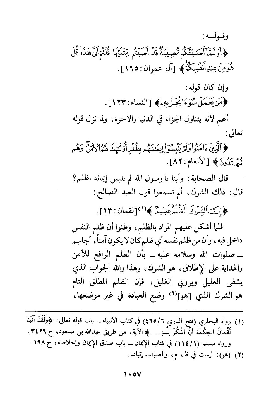 وقوله {أَوَلَمَّا أَصَابَتْكُمْ مُصِيبَةٌ قَدْ أَصَبْتُمْ مِثْلَيْهَا قُلْتُمْ أَنَّى هَذَا قُلْ هُوَ مِنْ عِنْدِ أَنْفُسِكُمْ} [آل عمران165] وإن كان قوله {مَنْ يَعْمَلْ سُوءاً يُجْزَ بِهِ} [النساء123] أعم لأنه يتناول الجزاء في الدنيا والآخرة ولما نزل قوله تعالى {الَّذِينَ آمَنُوا وَلَمْ يَلْبِسُوا إِيمَانَهُمْ بِظُلْمٍ أُولَئِكَ لَهُمُ الْأَمْنُ وَهُمْ مُهْتَدُونَ} [الأنعام82] قال الصحابة وأينا يا رسول الله لم يلبس إيمانه بظلم قال ذلك الشرك ألم تسمعوا قول العبد الصالح {إِنَّ الشِّرْكَ لَظُلْمٌ عَظِيمٌ} [لقمان13] فلما أشكل عليهم المراد بالظلم وظنوا أن ظلم النفس داخل فيه وأن من ظلم نفسه أي ظلم كان لا يكون آمنا أجابهم بأن الظلم الرافع للأمن والهداية على الإطلاق هو الشرك وهذا والله الجواب الذي يشفي العليل ويروي الغليل فإن الظلم المطلق التام هو الشرك الذي هو وضع العبادة في غير موضعها