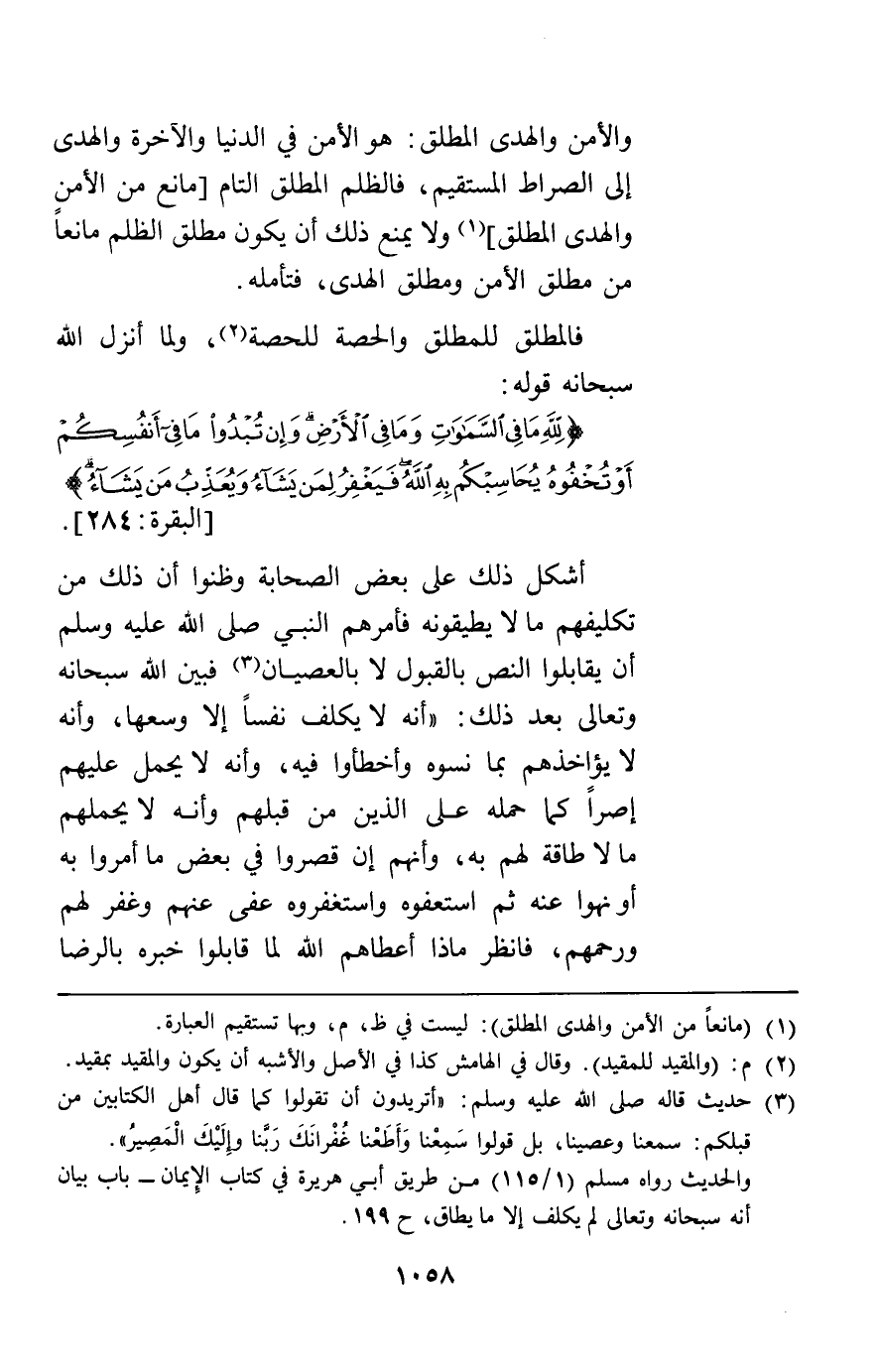 فالمطلق للمطلق والحصة للحصة ولما أنزل الله سبحانه قوله {لِلَّهِ مَا فِي السَّمَاوَاتِ وَمَا فِي الأَرْضِ وَإِنْ تُبْدُوا مَا فِي أَنْفُسِكُمْ أَو تُخْفُوهُ يُحَاسِبْكُمْ بِهِ اللَّهُ فَيَغْفِرُ لِمَنْ يَشَاءُ وَيُعَذِّبُ مَنْ يَشَاءُ} [البقرة284] أشكل ذلك على بعض الصحابة وظنوا أن ذلك من تكليفهم مالا يطيقونه فأمرهم النبي أن يقابلوا النص بالقبول لا بالعصيان فبين الله سبحانه وتعالى بعد ذلك أنه لا يكلف نفسا إلا وسعها وأنه لا يؤاخذهم بما نسوه وأخطأوا فيه وأنه لا يحمل عليهم إصرا كما حمله على الذين من قبلهم وأنه لا يحملهم مالا طاقة لهم به وأنهم إن قصروا في بعض ما أمروا به أو نهوا عنه ثم استعفوه واستغفروه عفى عنهم وغفر لهم ورحمهم فانظر ماذا أعطاهم الله لما قابلوا خبره بالرضا