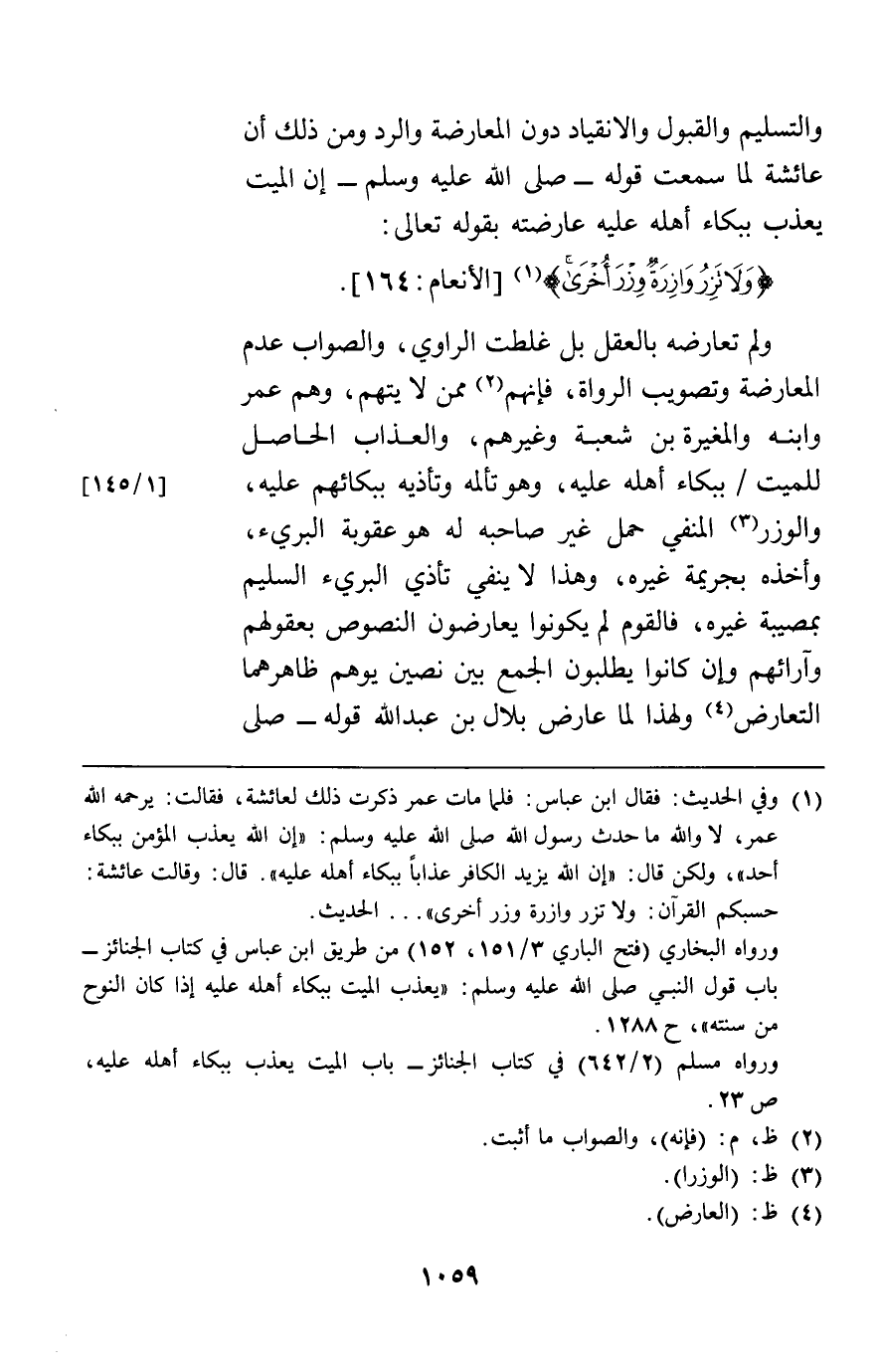 والتسليم والقبول والانقياد دون المعارضة والرد ومن ذلك أن عائشة لما سمعت قوله إن الميت يعذب ببكاء أهله عليه عارضته بقوله تعالى: {وَلا تَزِرُ وَازِرَةٌ وِزْرَ أُخْرَى} [الأنعام164] ولم تعارضه بالعقل بل غلطت الراوي والصواب عدم المعارضة وتصويب الرواة فإنهم ممن لا يتهم وهم عمر وابنه والمغيرة بن شعبة وغيرهم والعذاب الحاصل للميت ببكاء أهله عليه وهو تألمه وتأذيه ببكائهم عليه والوزر المنفي حمل غير صاحبه له هو عقوبة البريء وأخذه بجريمة غيره وهذا لا ينفي تأذي البريء السليم بمصيبة غيره فالقوم لم يكونوا يعارضون النصوص بعقولهم وآرائهم وإن كانوا يطلبون الجمع بين نصين يوهم ظاهرهما التعارض ولهذا لما عارض بلال بن عبد الله قوله صلى