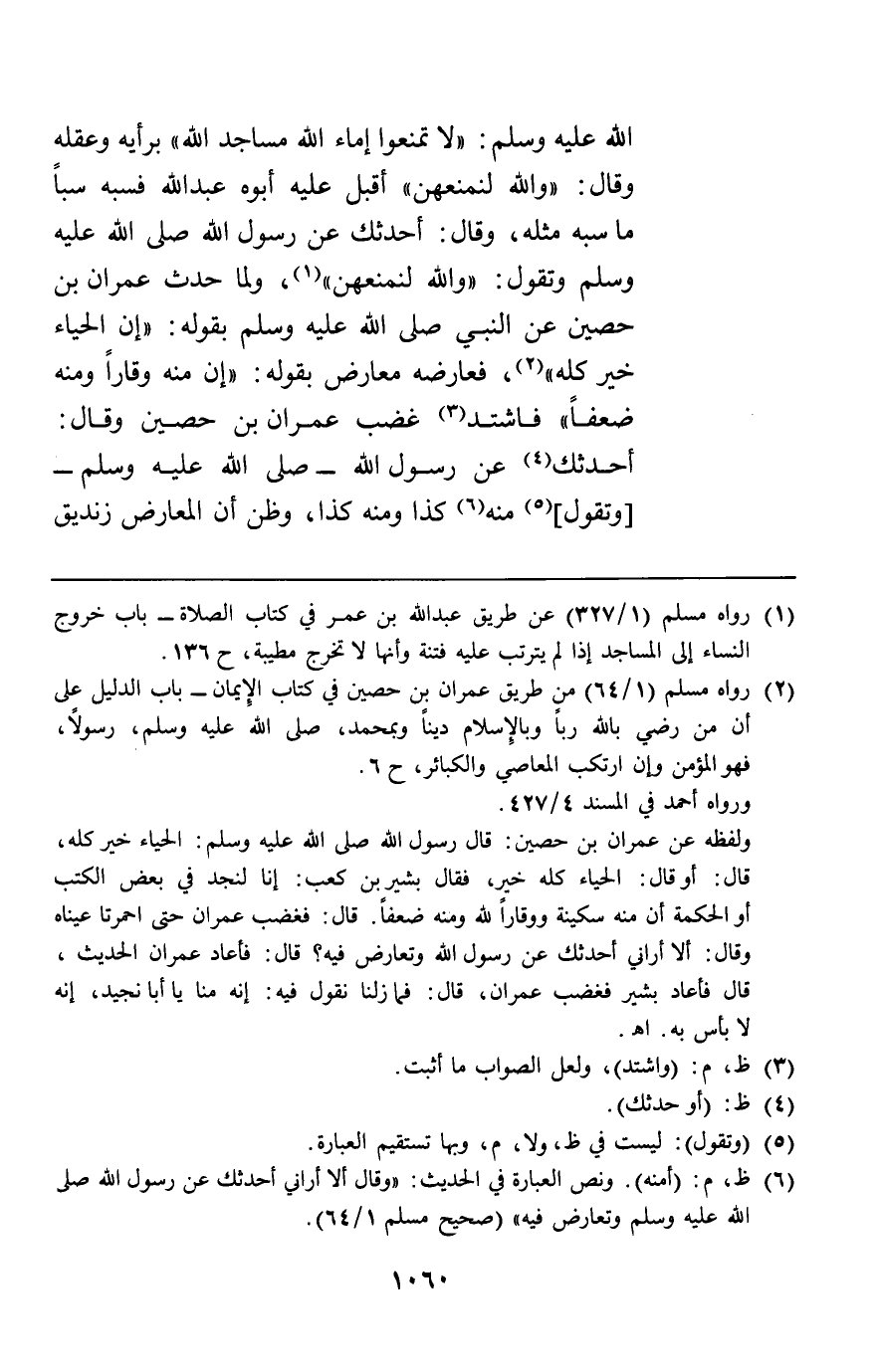 الله عليه وسلم: "لا تمنعوا إماء الله مساجد الله " برأيه وعقله وقال والله لنمنعهن أقبل عليه أبوه عبد الله فسبه سبا ما سبه مثله وقال أحدثك عن رسول الله وتقول والله لنمنعهن ولما حدث عمران بن حصين عن النبي صلى الله عليه وسلم بقوله: "إن الحياء خير كله" فعارضه معارض بقوله إن منه وقارا ومنه ضعفا فاشتد غضب عمران بن حصين وقال أحدثك عن رسول الله وتقول منه كذا ومنه كذا وظن أن المعارض زنديق