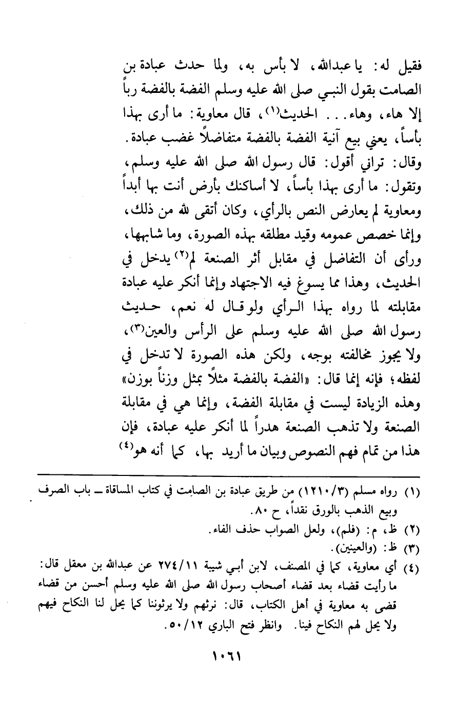 فقيل له يا عبد الله لا بأس به ولما حدث عبادة بن الصامت بقول النبي صلى الله عليه وسلم: "الفضة بالفضة ربا إلا هاء وهاء" الحديث قال معاوية ما أرى بهذا بأسا يعني بيع آنية الفضة بالفضة متفاضلا غضب عبادة وقال تراني أقول قال رسول الله وتقول ما أرى بهذا بأسا لا أساكنك بأرض أنت بها أبدا ومعاوية لم يعارض النص بالرأي وكان أتقى لله من ذلك وإنما خصص عمومه وقيد مطلقه بهذه الصورة وما شابهها ورأى أن التفاضل في مقابل أثر الصنعة لم يدخل في الحديث وهذا مما يسوغ فيه الاجتهاد وإنما أنكر عليه عبادة مقابلته لما رواه بهذا الرأي ولو قال له نعم حديث رسول الله على الرأس والعين ولا يجوز مخالفته بوجه ولكن هذه الصورة لا تدخل في لفظه فإنه إنما قال: "الفضة بالفضة مثلا بمثل وزنا بوزن" وهذه الزيادة ليست في مقابلة الفضة وإنما هي في مقابلة الصنعة ولا تذهب الصنعة هدرا لما أنكر عليه عبادة فإن هذا من تمام فهم النصوص وبيان ما أريد بها كما أنه هو