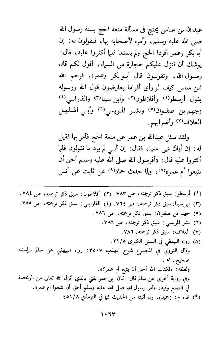 عبد الله بن عباس يحتج في مسألة متعة الحج بسنة رسول الله وأمره لأصحابه بها فيقولون له إن أبا بكر وعمر أفردا الحج ولم يتمتعا فلما أكثروا عليه قال يوشك أن تنزل عليكم حجارة من السماء أقول لكم قال رسول الله وتقولون قال أبو بكر وعمر فرحم الله ابن عباس كيف لو رأى أقواما يعارضون قول الله ورسوله بقول أرسطو وأفلاطون وابن سينا والفارابي وجهم بن صفوان وبشر المريسي وأبي الهذيل العلاف وأضرابهم.