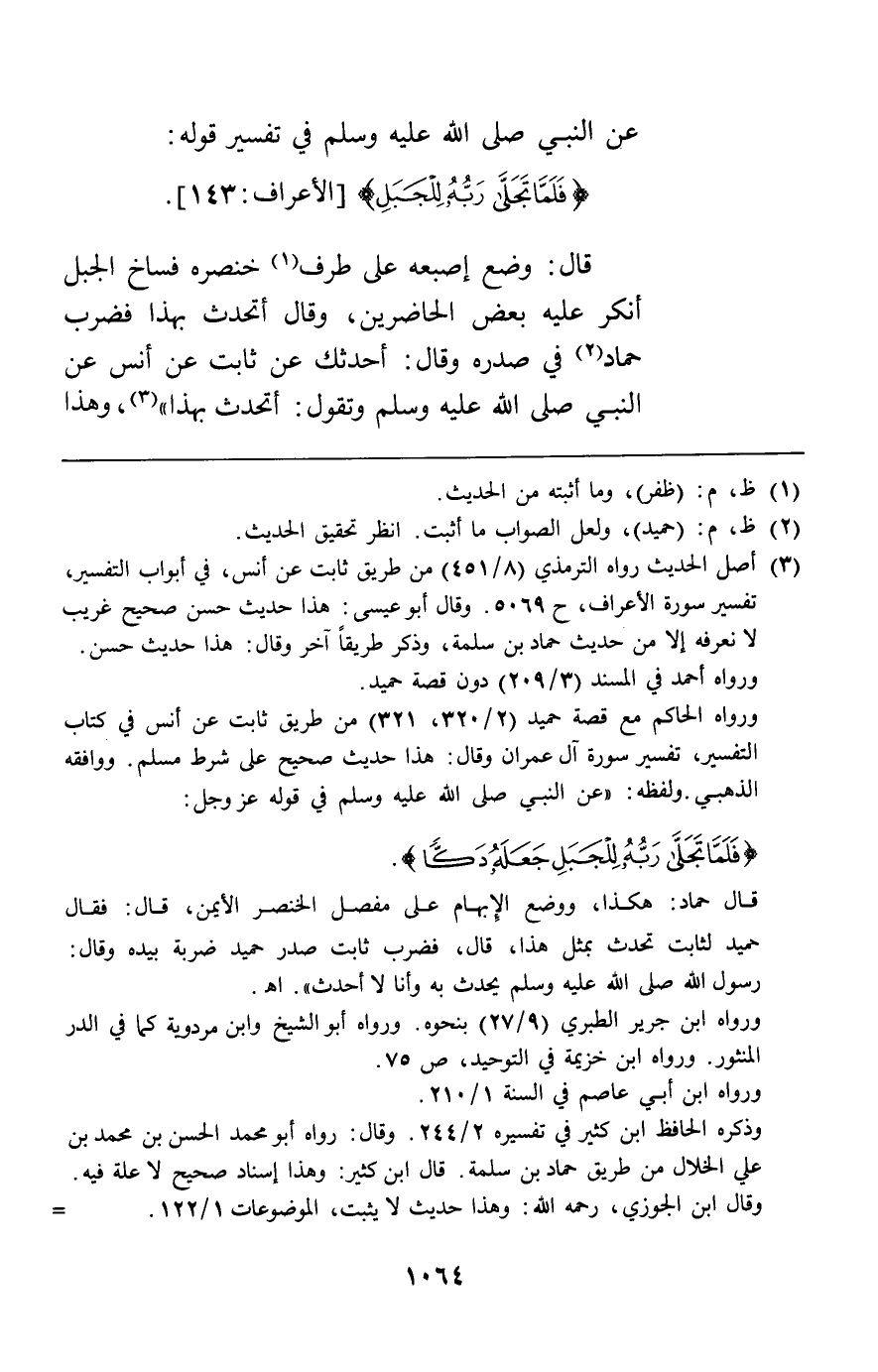 عن النبي في تفسير قوله {فَلَمَّا تَجَلَّى رَبُّهُ لِلْجَبَلِ} [الأعراف143] قال وضع إصبعه على طرف خنصره فساخ الجبل أنكر عليه بعض الحاضرين وقال أتحدث بهذا فضرب حماد في صدره وقال أحدثك عن ثابت عن أنس عن النبي وتقول أتحدث بهذا وهذا