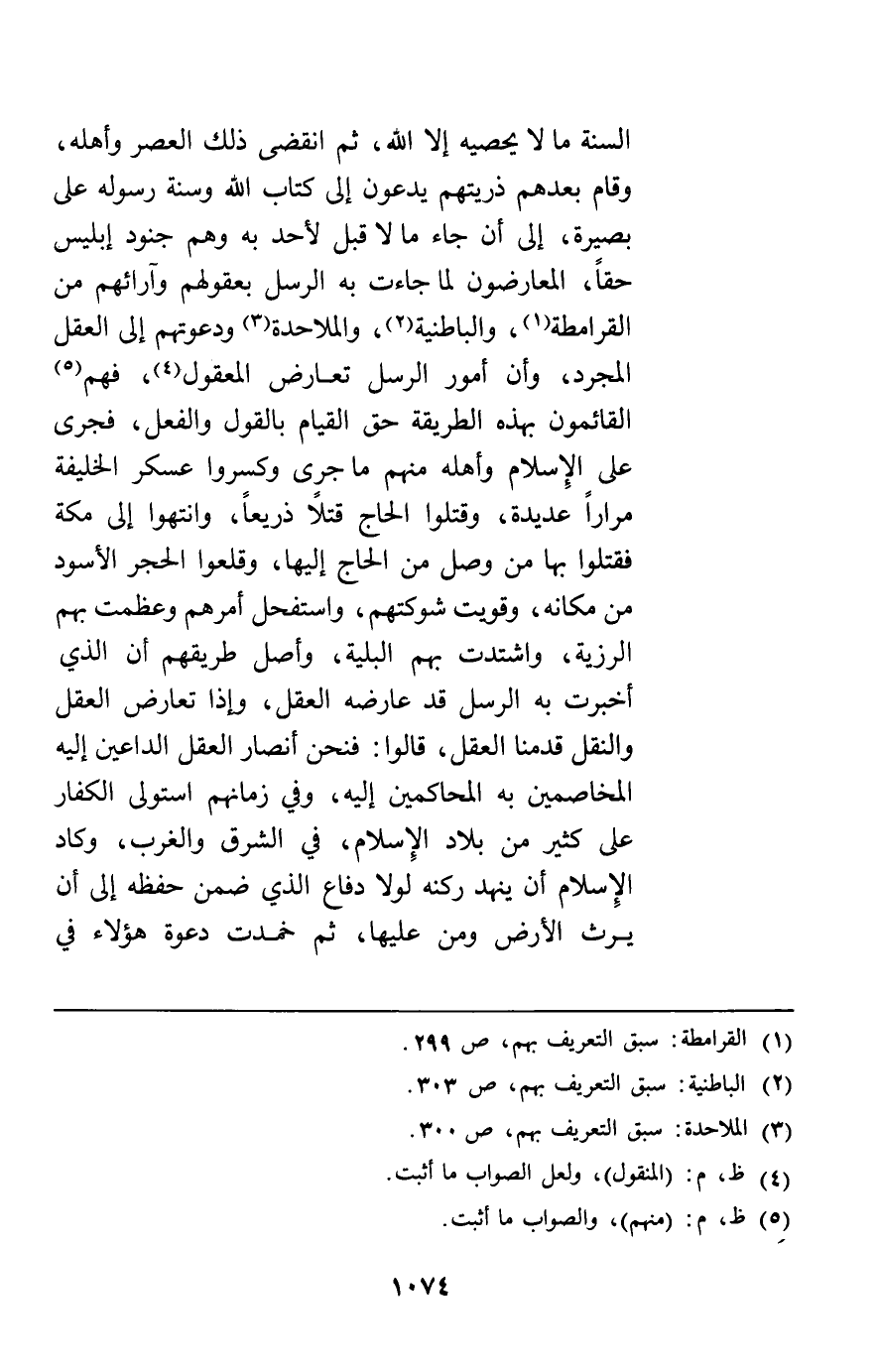 السنة مالا يحصيه إلا الله ثم انقضى ذلك العصر وأهله وقام بعدهم ذريتهم يدعون إلى كتاب الله وسنة رسوله على بصيرة إلى أن جاء ما لا قبل لأحد به وهم جنود إبليس حقا المعارضون لما جاءت به الرسل بعقولهم وآرائهم من القرامطة والباطنية والملاحدة ودعوتهم إلى العقل المجرد وأن أمور الرسل تعارض المعقول فهم القائمون بهذه الطريقة حق القيام بالقول والفعل فجرى على الإسلام وأهله منهم ما جرى وكسروا عسكر الخليفة مرارا عديدة وقتلوا الحاج قتلا ذريعا وانتهوا إلى مكة فقتلوا بها من وصل من الحاج إليها وقلعوا الحجر الأسود من مكانه وقويت شوكتهم واستفحل أمرهم وعظمت بهم الرزية واشتدت بهم البلية وأصل طريقهم أن الذي أخبرت به الرسل قد عارضه العقل وإذا تعارض العقل والنقل قدمنا العقل قالوا فنحن أنصار العقل الداعون إليه المخاصمون به المحاكمون إليه وفي زمانهم استولى الكفار على كثير من بلاد الإسلام في الشرق والغرب وكاد الإسلام أن ينهد ركنه لولا دفاع الذي ضمن حفظه إلى أن يرث الأرض ومن عليها ثم خمدت دعوة هؤلاء في