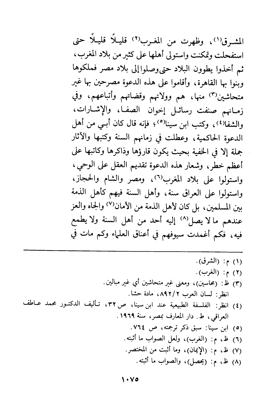 المشرق وظهرت من المغرب قليلا قليلا حتى استفحلت وتمكنت واستولى أهلها على كثير من بلاد المغرب ثم أخذوا يطوون البلاد حتى وصلوا إلى بلاد مصر فملكوها وبنوا بها القاهرة وأقاموا على هذه الدعوة مصرحين بها غير متحاشين منها هم وولاتهم وقضاتهم وأتباعهم وفي زمانهم صنفت رسائل إخوان الصفا والإشارات والشفا وكتب ابن سينا فإنه قال كان أبي من أهل الدعوة الحاكمية وعطلت في زمانهم السنة وكتبها والآثار جملة إلا في الخفية بحيث يكون قارؤها وذاكرها وكاتبها على أعظم خطر وشعار هذه الدعوة تقديم العقل على الوحي واستولوا على بلاد المغرب ومصر والشام والحجاز واستولوا على العراق سنة وأهل السنة فيهم كأهل الذمة بين المسلمين بل كان لأهل الذمة من الأمان والجاه والعز عندهم مالا يصل إليه أحد من أهل السنة ولا يطمع فيه فكم أغمدت سيوفهم في أعناق العلماء وكم مات في