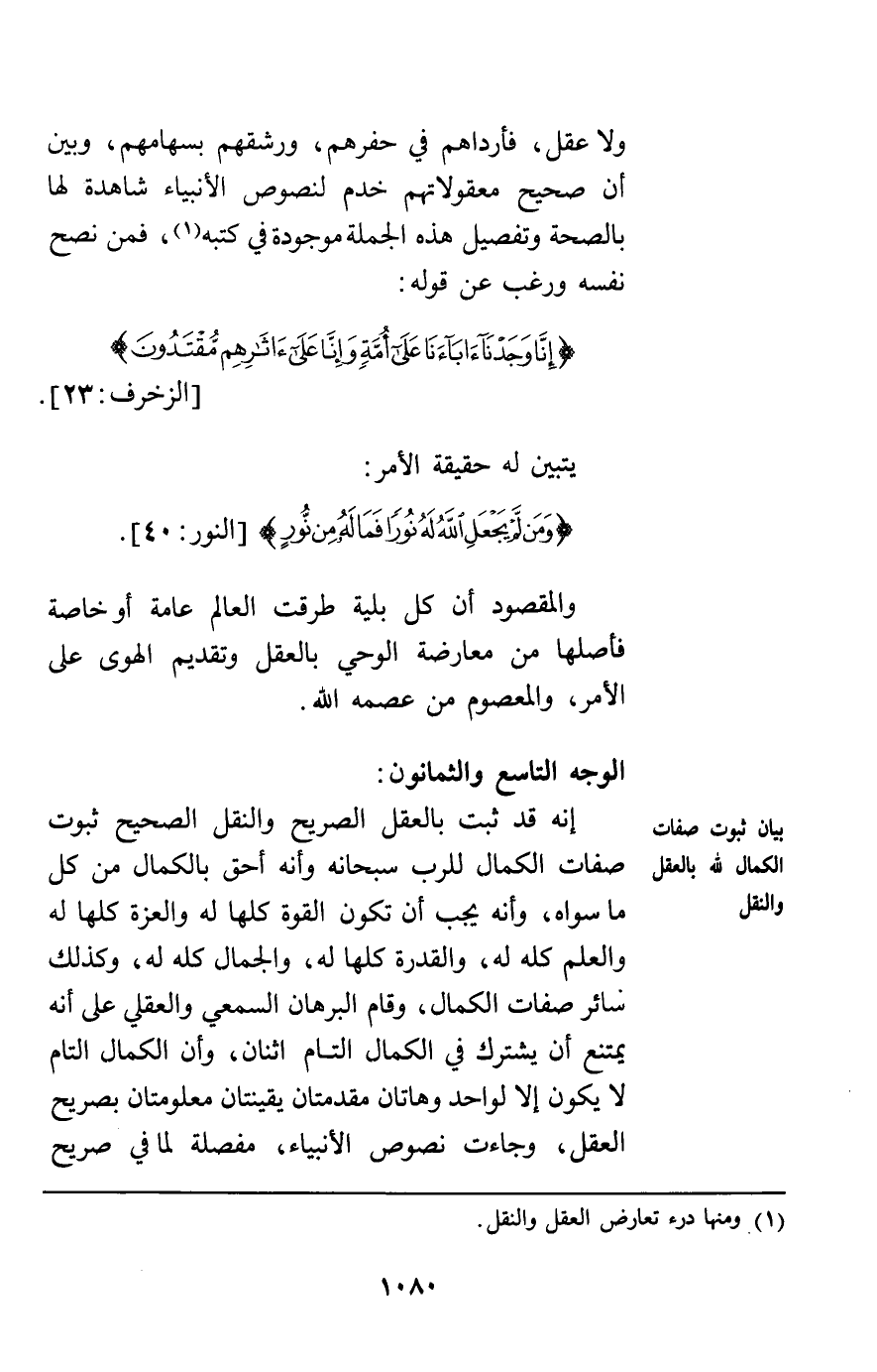 ولا عقل فأرداهم في حفرهم ورشقهم بسهامهم وبين أن صحيح معقولاتهم خدم لنصوص الأنبياء شاهدة لها بالصحة وتفصيل هذه الجملة موجودة في كتبه فمن نصح نفسه ورغب عن قوله: {إِنَّا وَجَدْنَا آبَاءَنَا عَلَى أُمَّةٍ وَإِنَّا عَلَى آثَارِهِمْ مُقْتَدُونَ} [الزخرف23] يتبين له حقيقة الأمر {وَمَنْ لَمْ يَجْعَلِ اللَّهُ لَهُ نُوراً فَمَا لَهُ مِنْ نُورٍ} [النور40] والمقصود أن كل بلية طرقت العالم عامة أو خاصة فأصلها من معارضة الوحي بالعقل وتقديم الهوى على الأمر والمعصوم من عصمه الله.