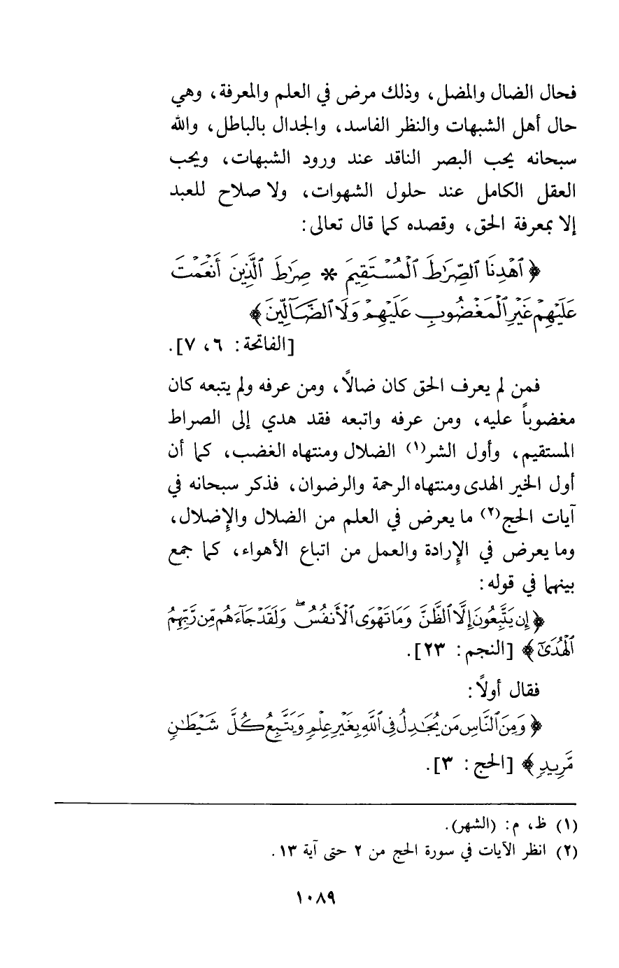 فحال الضال والمضل وذلك مرض في العلم والمعرفة وهي حال أهل الشبهات والنظر الفاسد والجدال بالباطل والله سبحانه يحب البصر الناقد عند ورود الشبهات ويحب العقل الكامل عند حلول الشهوات ولا صلاح للعبد إلا بمعرفة الحق وقصده كما قال تعالى: {اهْدِنَا الصِّرَاطَ الْمُسْتَقِيمَ صِرَاطَ الَّذِينَ أَنْعَمْتَ عَلَيْهِمْ غَيْرِ الْمَغْضُوبِ عَلَيْهِمْ وَلا الضَّالِّينَ} [الفاتحة7 , 6] فمن لم يعرف الحق كان ضالا ومن عرفه ولم يتبعه كان مغضوبا عليه ومن عرفه واتبعه فقد هدي إلى الصراط المستقيم وأول الشر الضلال ومنتهاه الغضب كما أن أول الخير الهدى ومنتهاه الرحمة والرضوان فذكر سبحانه في آيات الحج ما يعرض في العلم من الضلال والإضلال وما يعرض في الإرادة والعمل من اتباع الأهواء كما جمع بينهما في قوله: {إِنْ يَتَّبِعُونَ إِلاَّ الظَّنَّ وَمَا تَهْوَى الأَنْفُسُ وَلَقَدْ جَاءَهُمْ مِنْ رَبِّهِمُ الْهُدَى} [النجم23] فقال أولا {وَمِنَ النَّاسِ مَنْ يُجَادِلُ فِي اللَّهِ بِغَيْرِ عِلْمٍ وَيَتَّبِعُ كُلَّ شَيْطَانٍ مَرِيدٍ} [الحج3] .