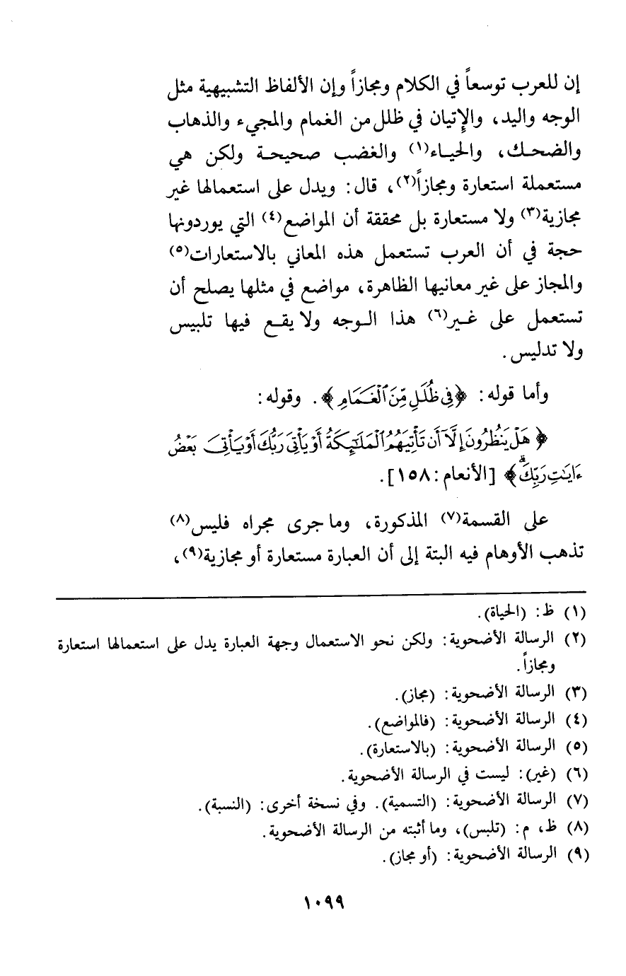 وأما قوله {اللَّهُ فِي ظُلَلٍ مِنَ الْغَمَامِ} وقوله: {هَلْ يَنْظُرُونَ إِلاَّ أَنْ تَأْتِيَهُمُ الْمَلائِكَةُ أَوْ يَأْتِيَ رَبُّكَ أَوْ يَأْتِيَ بَعْضُ آيَاتِ رَبِّكَ} [الأنعام 158] على القسمة المذكورة وما جرى مجراه فليس تذهب الأوهام فيه البتة إلى أن العبارة مستعارة أو مجازية