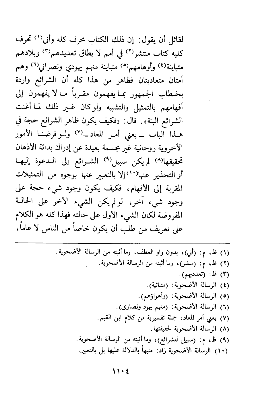 لقائل أن يقول إن ذلك الكتاب محرف كله وأنى يحرف كلية كتاب منتشر في أمم لا يطاق تعديدهم وبلادهم متباينة وأوهامهم متباينة منهم يهودي ونصراني وهم أمتان متعاديتان فظاهر من هذا كله أن الشرائع واردة بخطاب الجمهور بما يفهمون مقربا مالا يفهمون إلى أفهامهم بالتمثيل والتشبيه ولو كان غير ذلك لما أغنت الشرائع البتة قال فكيف يكون ظاهر الشرائع حجة في هذا الباب يعني أمر المعاد ولو فرضنا الأمور الأخروية روحانية غير مجسمة بعيدة عن إدراك بدائة الأذهان تحقيقها لم يكن سبيل الشرائع إلى الدعوة إليها أو التحذير عنها إلا بالتعبير عنها بوجوه من التمثيلات المقربة إلى الأفهام فكيف يكون وجود شيء حجة على وجود شيء آخر لو لم يكن الشيء الآخر على الحالة المفروضة لكان الشيء الأول على حالته فهذا كله هو الكلام على تعريف من طلب أن يكون خاصا من الناس لا عاما