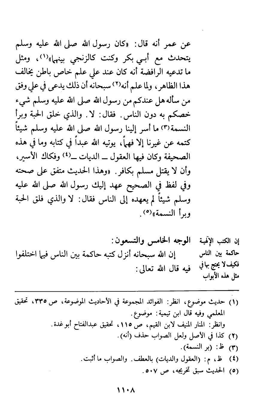 عن عمر أنه قال كان رسول الله يتحدث مع أبي بكر وكنت كالزنجي بينهما ومثل ما تدعيه الرافضة أنه كان عند علي علم خاص باطن يخالف هذا الظاهر ولما علم أنه سبحانه أن ذلك يدعى في علي وفق من سأله هل عندكم من رسول الله شيء خصكم به دون الناس فقال لا والذي خلق الحبة وبرأ النسمة ما أسر إلينا رسول الله شيئا كتمه عن غيرنا إلا فهما يؤتيه الله عبدا في كتابه وما في هذه الصحيفة وكان فيها العقول الديات وفكاك الأسير وأن لا يقتل مسلم بكافر وهذا الحديث متفق على صحته وفي لفظ في الصحيح عهد إليك رسول الله شيئا لم يعهده إلى الناس فقال لا والذي فلق الحبة وبرأ النسمة.
