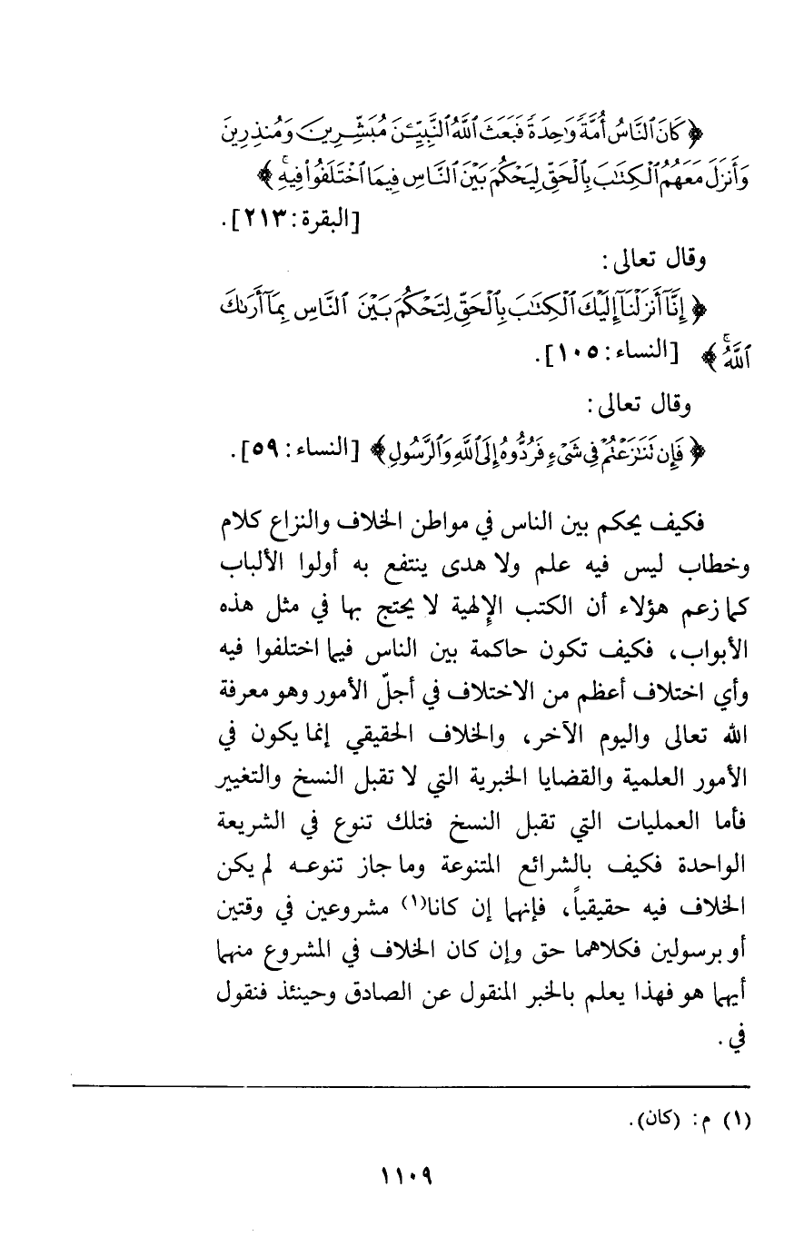 {كَانَ النَّاسُ أُمَّةً وَاحِدَةً فَبَعَثَ اللَّهُ النَّبِيِّينَ مُبَشِّرِينَ وَمُنْذِرِينَ وَأَنْزَلَ مَعَهُمُ الْكِتَابَ بِالْحَقِّ لِيَحْكُمَ بَيْنَ النَّاسِ فِيمَا اخْتَلَفُوا فِيهِ} [البقرة213] وقال تعالى {إِنَّا أَنْزَلْنَا إِلَيْكَ الْكِتَابَ بِالْحَقِّ لِتَحْكُمَ بَيْنَ النَّاسِ بِمَا أَرَاكَ اللَّهُ} [النساء105] وقال تعالى {فَإِنْ تَنَازَعْتُمْ فِي شَيْءٍ فَرُدُّوهُ إِلَى اللَّهِ وَالرَّسُولِ} [النساء59] فكيف يحكم بين الناس في مواطن الخلاف والنزاع كلام وخطاب ليس فيه علم ولا هدى ينتفع به أولوا الألباب كما زعم هؤلاء أن الكتب الإلهية لا يحتج بها في مثل هذه الأبواب فكيف تكون حاكمة بين الناس فيما اختلفوا فيه وأي اختلاف أعظم من الاختلاف في أجل الأمور وهو معرفة الله تعالى واليوم الآخر والخلاف الحقيقي إنما يكون في الأمور العلمية والقضايا الخبرية التي لا تقبل النسخ والتغيير فأما العمليات التي تقبل النسخ فتلك تنوع في الشريعة الواحدة فكيف بالشرائع المتنوعة وما جاز تنوعه لم يكن الخلاف فيه حقيقيا فإنهما إن كانا مشروعين في وقتين أو برسولين فكلاهما حق وإن كان الخلاف في المشروع منهما أيهما هو فهذا يعلم بالخبر المنقول عن الصادق وحينئذ فنقول في.