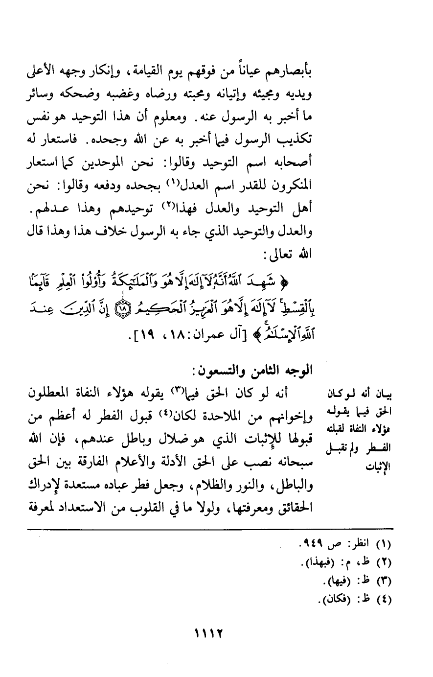 بأبصارهم عيانا من فوقهم يوم القيامة وإنكار وجهه الأعلى ويديه ومجيئه وإتيانه ومحبته ورضاه وغضبه وضحكه وسائر ما أخبر به الرسول عنه ومعلوم أن هذا التوحيد هو نفس تكذيب الرسول فيما أخبر به عن الله وجحده فاستعار له أصحابه اسم التوحيد وقالوا نحن الموحدون كما استعار المنكرون للقدر اسم العدل بجحده ودفعه وقالوا نحن أهل التوحيد والعدل فهذا توحيدهم وهذا عدلهم والعدل والتوحيد الذي جاء به الرسول خلاف هذا وهذا قال الله تعالى: {شَهِدَ اللَّهُ أَنَّهُ لا إِلَهَ إِلاَّ هُوَ وَالْمَلائِكَةُ وَأُولُو الْعِلْمِ قَائِماً بِالْقِسْطِ لا إِلَهَ إِلاَّ هُوَ الْعَزِيزُ الْحَكِيمُ إِنَّ الدِّينَ عِنْدَ اللَّهِ الأِسْلامُ} [آل عمران19 , 18]