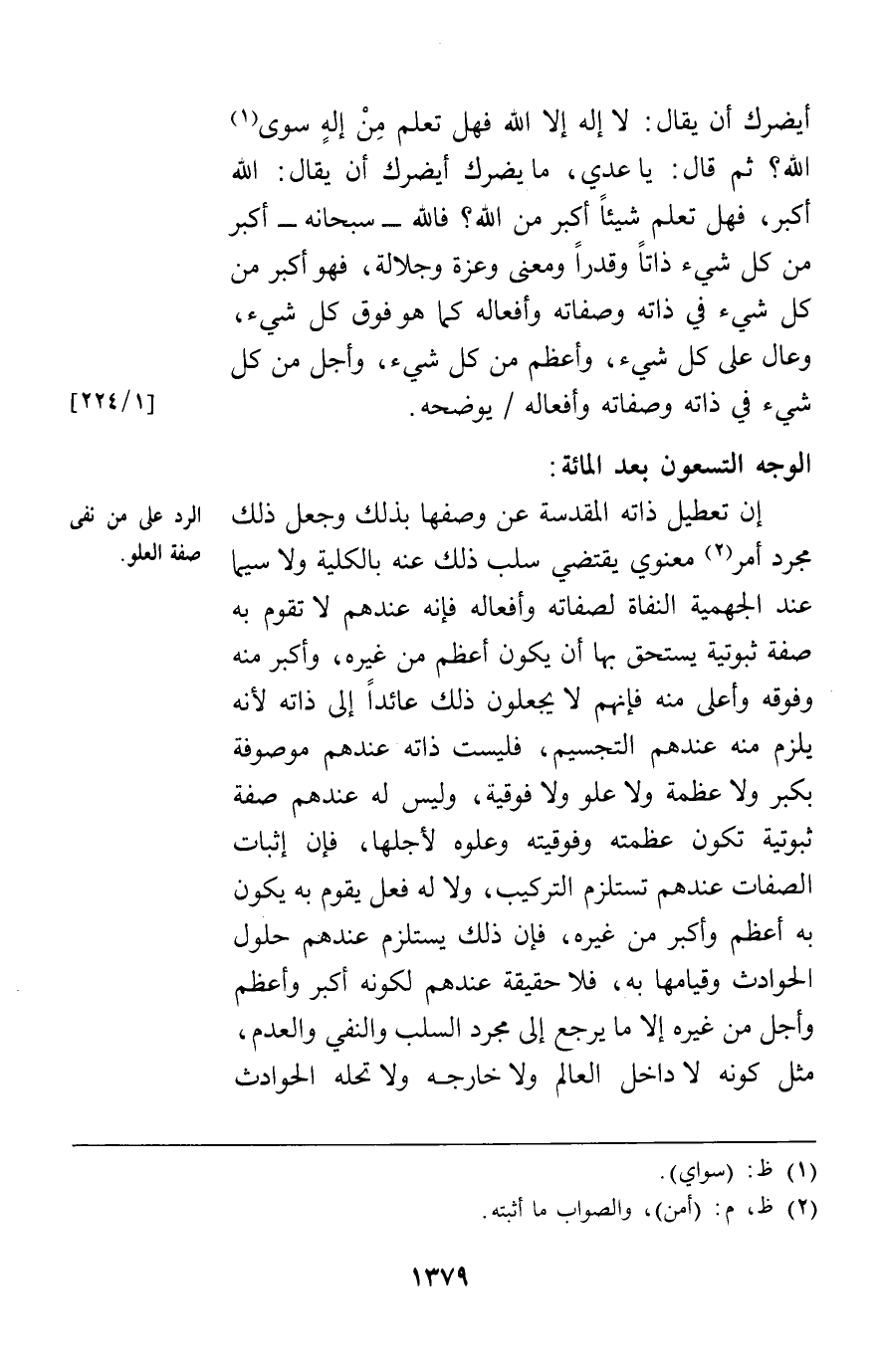 الوجه التسعون بعد المائة: إن تعطيل ذاته المقدسة عن وصفها بذلك وجعل ذلك مجرد أمر معنوي يقتضي سلب ذلك عنه بالكلية ولا سيما عند الجهمية النفاة لصفاته وأفعاله فإنه عندهم لا تقوم به صفة ثبوتية يستحق بها أن يكون أعظم من غيره وأكبر منه وفوقه وأعلى منه فإنهم لا يجعلون ذلك عائدا إلى ذاته لأنه يلزم منه عندهم التجسيم فليست ذاته عندهم موصوفة بكبر ولا عظمة ولا علو ولا فوقية وليس له عندهم صفة ثبوتية تكون عظمته وفوقيته وعلوه لأجلها فإن إثبات الصفات عندهم يستلزم التركيب ولا له فعل يقوم به يكون به أعظم وأكبر من غيره فإن ذلك يستلزم عندهم حلول الحوادث وقيامها به فلا حقيقة عندهم لكونه أكبر وأعظم وأجل من غيره إلا ما يرجع إلى مجرد السلب والنفي والعدم مثل كونه لا داخل العالم ولا خارجه ولا تحله الحوادث