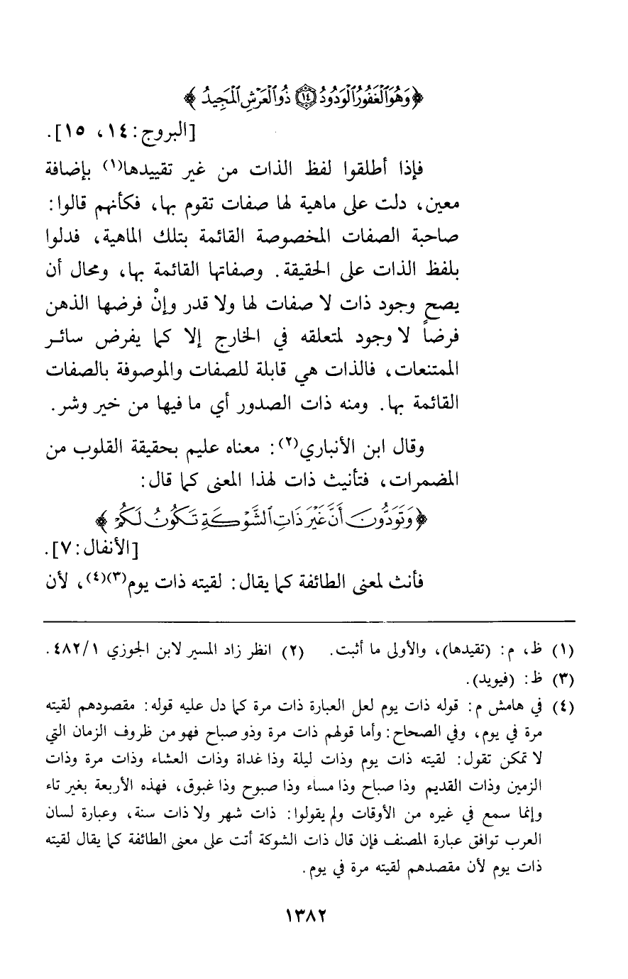 {وَهُوَ الْغَفُورُ الْوَدُودُ ذُو الْعَرْشِ الْمَجِيدُ} [البروج15 , 14] فإذا أطلقوا لفظ الذات من غير تقييدها بإضافة معين دلت على ماهية لها صفات تقوم بها فكأنهم قالوا صاحبة الصفات المخصوصة القائمة بتلك الماهية فدلوا بلفظ الذات على الحقيقة وصفاتها القائمة بها ومحال أن يصح وجود ذات لا صفات لها ولا قدر وإن فرضها الذهن فرضا لا وجود لمتعلقه في الخارج إلا كما يفرض سائر الممتنعات فالذات هي قابلة للصفات والموصوفة بالصفات القائمة بها ومنه ذات الصدور أي ما فيها من خير وشر. وقال ابن الأنباري معناه عليم بحقيقة القلوب من المضمرات فتأنيث ذات لهذا المعنى كما قال {وَتَوَدُّونَ أَنَّ غَيْرَ ذَاتِ الشَّوْكَةِ تَكُونُ لَكُمْ} [الأنفال7] فأنث لمعنى الطائفة كما يقال لقيته ذات يوم لأن