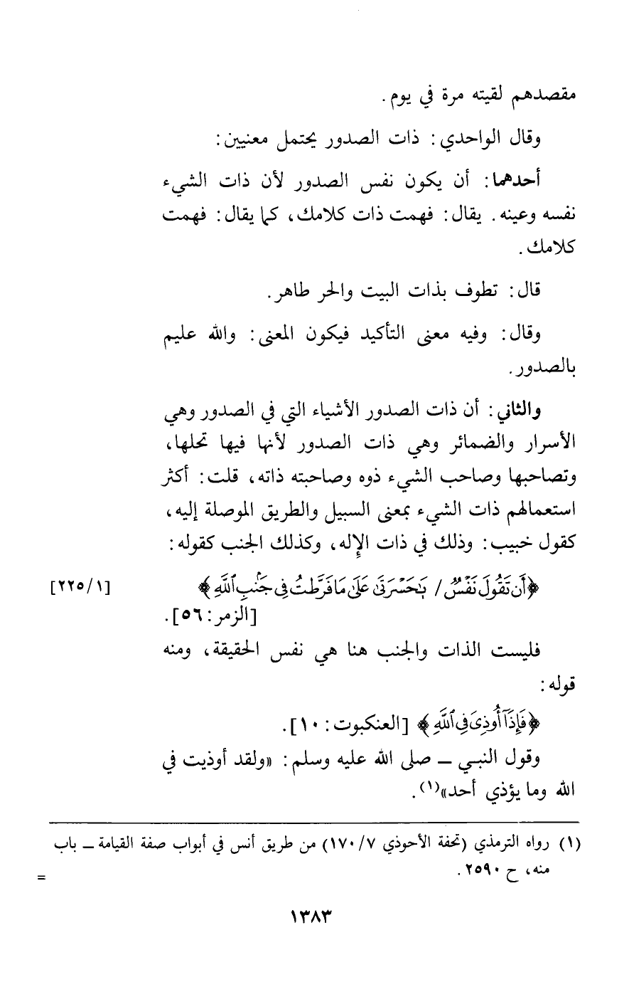 والثاني أن ذات الصدور الأشياء التي في الصدور وهي الأسرار والضمائر وهي ذات الصدور لأنها فيها تحلها وتصاحبها وصاحب الشيء ذوه وصاحبته ذاته قلت أكثر استعمالهم ذات الشيء بمعنى السبيل والطريق الموصلةإليه كقول خبيب وذلك في ذات الإله وكذلك الجنب كقوله {أَنْ تَقُولَ نَفْسٌ يَا حَسْرَتَى عَلَى مَا فَرَّطْتُ فِي جَنْبِ اللَّهِ} [الزمر56] فليست الذات والجنب هنا هي نفس الحقيقة ومنه قوله {فَإِذَا أُوذِيَ فِي اللَّهِ} [العنكبوت10] وقول النبي صلى الله عليه وسلم: "ولقد أوذيت في الله وما يؤذي أحد".