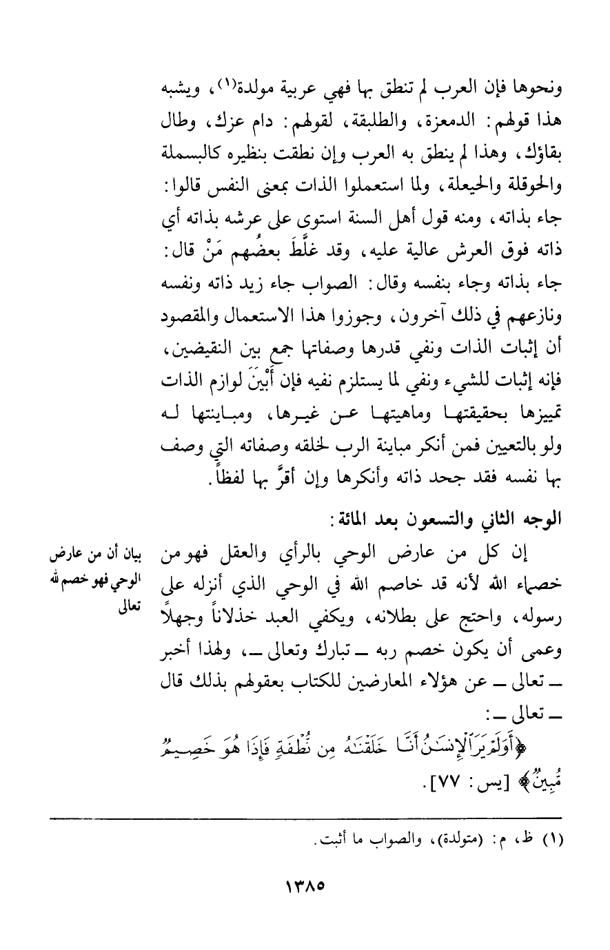 الوجه الثاني والتسعون بعد المائة: إن كل من عارض الوحي بالرأي والعقل فهو من خصماء الله لأنه قد خاصم الله في الوحي الذي أنزله على رسوله واحتج على بطلانه ويكفي العبد خذلانا وجهلا وعمى أن يكون خصم ربه تبارك وتعالى ولهذا أخبر تعالى عن هؤلاء المعارضين للكتاب بعقولهم بذلك قال تعالى {أَوَلَمْ يَرَ الْأِنْسَانُ أَنَّا خَلَقْنَاهُ مِنْ نُطْفَةٍ فَإِذَا هُوَ خَصِيمٌ مُبِينٌ} [يس77] .