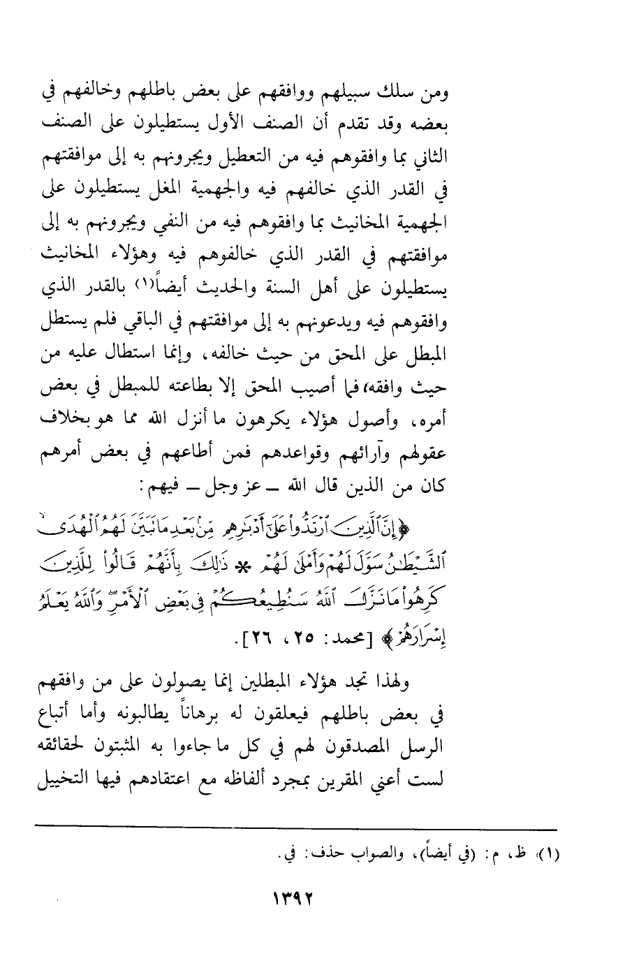 ومن سلك سبيلهم ووافقهم على بعض باطلهم وخالفهم في بعضه وقد تقدم أن الصنف الأول يستطيلون على الصنف الثاني بما وافقوهم فيه من التعطيل ويجرونهم به إلى موافقتهم في القدر الذي خالفوهم فيه والجهمية المغل يستطيلون على الجهمية المخانيث بما وافقوهم فيه من النفي ويجرونهم به إلى موافقتهم في القدر الذي خالفوهم فيه وهؤلاء المخانيث يستطيلون على أهل السنة والحديث أيضا بالقدر الذي وافقوهم فيه ويدعونهم به إلى موافقتهم في الباقي فلم يستطل المبطل على المحق من حيث خالفه وإنما استطال عليه من حيث وافقه فما أصيب المحق إلا بطاعته للمبطل في بعض أمره وأصول هؤلاء يكرهون ما أنزل الله مما هو بخلاف عقولهم وآرائهم وقواعدهم فمن أطاعهم في بعض أمرهم كان من الذين قال الله عز وجل فيهم {إِنَّ الَّذِينَ ارْتَدُّوا عَلَى أَدْبَارِهِمْ مِنْ بَعْدِ مَا تَبَيَّنَ لَهُمُ الْهُدَى الشَّيْطَانُ سَوَّلَ لَهُمْ وَأَمْلَى لَهُمْ ذَلِكَ بِأَنَّهُمْ قَالُوا لِلَّذِينَ كَرِهُوا مَا نَزَّلَ اللَّهُ سَنُطِيعُكُمْ فِي بَعْضِ الْأَمْرِ وَاللَّهُ يَعْلَمُ إِسْرَارَهُمْ} [محمد26 , 25] ولهذا تجد هؤلاء المبطلين إنما يصولون على من وافقهم في بعض باطلهم فيعلقون له برهانا يطالبونه وأما أتباع الرسل المصدقون لهم في كل ما جاءوا به المثبتون لحقائقه لست أعني المقرين بمجرد ألفاظه مع اعتقادهم فيها التخييل