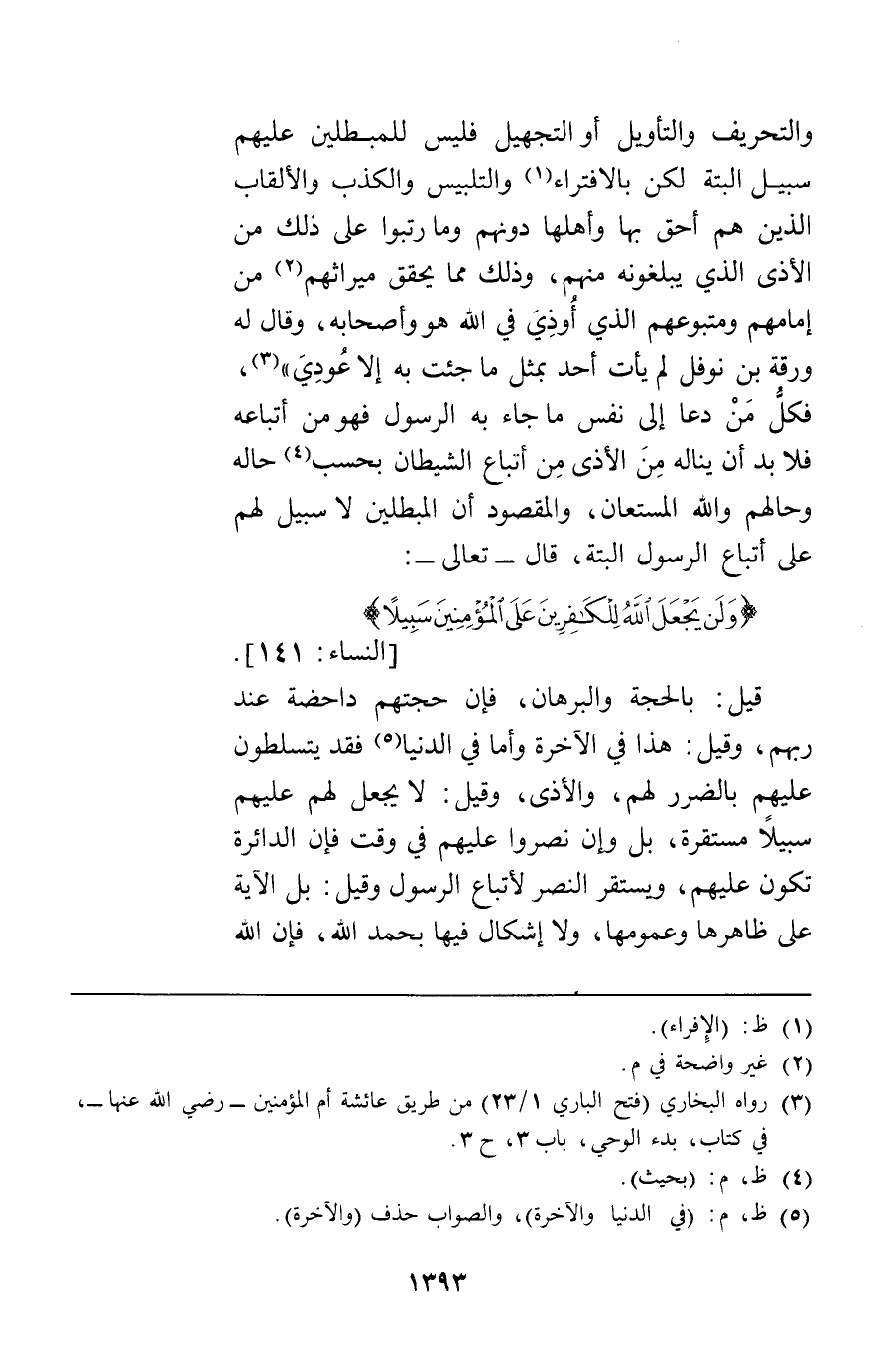 والتحريف والتأويل أو التجهيل فليس للمبطلين عليهم سبيل البتة لكن بالافتراء والتلبيس والكذب والألقاب الذين هم أحق بها وأهلها دونهم وما رتبوا على ذلك من الأذى الذي يبلغونه منهم وذلك مما يحقق ميراثهم من إمامهم ومتبوعهم الذي أوذي في الله هو وأصحابه وقال له ورقة بن نوفل لم يأت أحد بمثل ما جئت به إلا عودي فكل من دعا إلى نفس ما جاء به الرسول فهو من أتباعه فلا بد أن يناله من الأذى من أتباع الشيطان بحسب حاله وحالهم والله المستعان والمقصود أن المبطلين لا سبيل لهم على أتباع الرسول البتة قال تعالى {وَلَنْ يَجْعَلَ اللَّهُ لِلْكَافِرِينَ عَلَى الْمُؤْمِنِينَ سَبِيلاً} [السناء141] قيل بالحجة والبرهان فإن حجتهم داحضة عند ربهم وقيل هذا في الآخرة وأما في الدنيا فقد يتسلطون عليهم بالضرر لهم والأذى وقيل لا يجعل لهم عليهم سبيلا مستقرة بل وإن نصروا عليهم في وقت فإن الدائرة تكون عليهم ويستقر النصر لأتباع الرسول وقيل بل الآية على ظاهرها وعمومها ولا إشكال فيها بحمد الله فإن الله