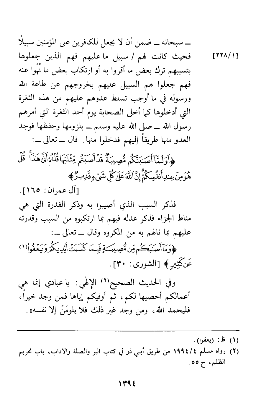 سبحانه ضمن أن لا يجعل للكافرين على المؤمنين سبيلا فحيث كانت لهم سبيل ما عليهم فهم الذين جعلوها بتسببهم ترك بعض ما أقروا به أو ارتكاب بعض ما نهوا عنه فهم جعلوا لهم السبيل عليهم بخروجهم عن طاعة الله ورسوله في ما أوجب تسلط عدوهم عليهم من هذه الثغرة التي أخلوها كما أخلى الصحابة يوم أحد الثغرة التي أمرهم رسول الله صلى الله عليه وسلم بلزومها وحفظها فوجد العدو منها طريقا إليهم فدخلوا منها قال تعالى {أَوَلَمَّا أَصَابَتْكُمْ مُصِيبَةٌ قَدْ أَصَبْتُمْ مِثْلَيْهَا قُلْتُمْ أَنَّى هَذَا قُلْ هُوَ مِنْ عِنْدِ أَنْفُسِكُمْ إِنَّ اللَّهَ عَلَى كُلِّ شَيْءٍ قَدِيرٌ} [آل عمران165] فذكر السبب الذي أصيبوا به وذكر القدرة التي هي مناط الجزاء فذكر عدله فيهم بما ارتكبوه من السبب وقدرته عليهم بما نالهم به من المكروه وقال تعالى {وَمَا أَصَابَكُمْ مِنْ مُصِيبَةٍ فَبِمَا كَسَبَتْ أَيْدِيكُمْ وَيَعْفُو عَنْ كَثِيرٍ} [الشورى30] وفي الحديث الصحيح الإلهي "يا عبادي إنما هي أعمالكم أحصيها لكم ثم أوفيكم إياها فمن وجد خيرا فليحمد الله ومن وجد غير ذلك فلا يلومن إلا نفسه".