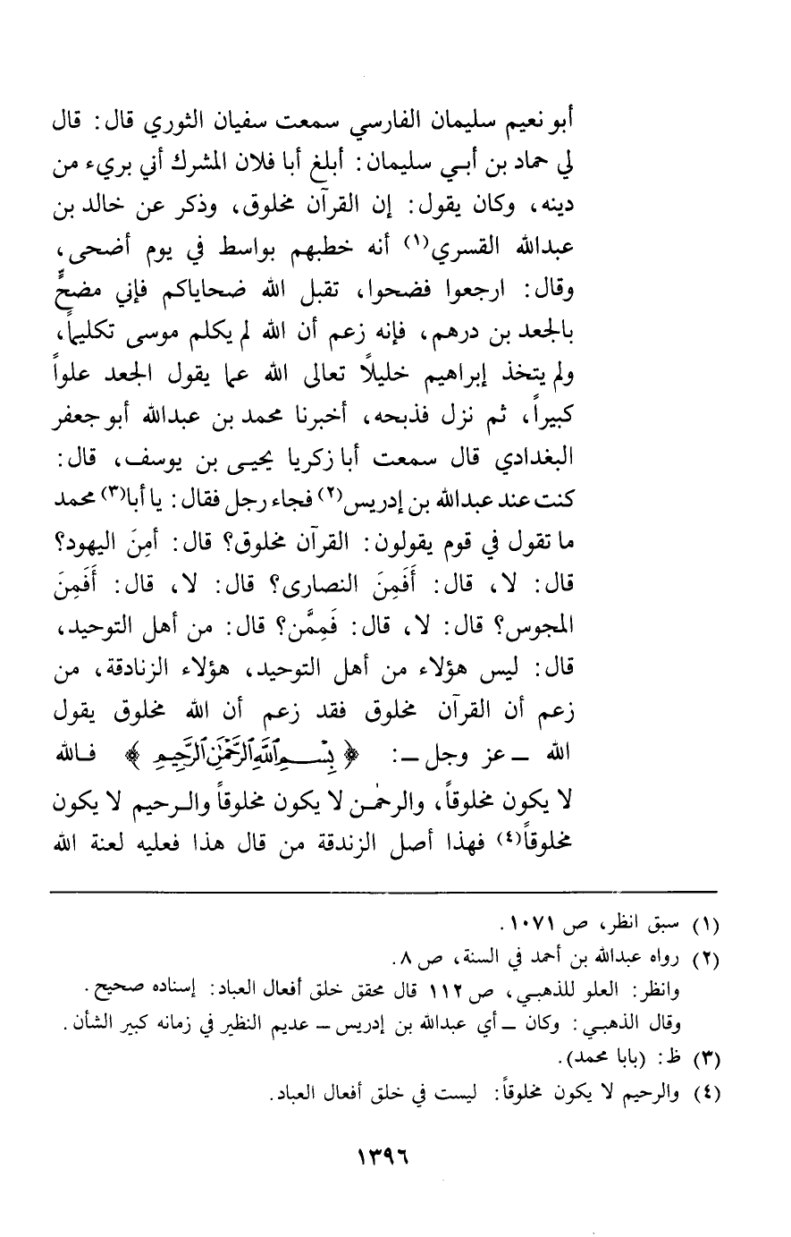 أبو نعيم سليمان الفارسي سمعت سفيان الثوري قال قال لي حماد بن أبي سليمان أبلغ أبا فلان المشرك أني بريء من دينه وكان يقول إن القرآن مخلوق وذكر عن خالد بن عبد الله القسري أنه خطبهم بواسط في يوم أضحى وقال ارجعوا فضحوا تقبل الله ضحاياكم فإني مضح بالجعد بن درهم فإنه زعم أن الله لم يكلم موسى تكليما ولم يتخذ إبراهيم خليلا تعالى الله عما يقول الجعد علوا كبيرا ثم نزل فذبحه أخبرنا محمد بن عبد الله أبو جعفر البغدادي قال سمعت أبا زكريا يحيى بن يوسف قال كنت عند عبد الله بن إدريس فجاء رجل فقال يا أبا محمد ما تقول في قوم يقولون القرآن مخلوق قال أمن اليهود قال لا قال أفمن النصارى قال لا قال أفمن المجوس قال لا قال فممن قال من أهل التوحيد قال ليس هؤلاء من أهل التوحيد هؤلاء الزنادقة من زعم أن القرآن مخلوق فقد زعم أن الله مخلوق يقول الله عز وجل {بِسْمِ اللَّهِ الرَّحْمَنِ الرَّحِيمِ} فالله لا يكون مخلوقا والرحمن لا يكون مخلوقا والرحيم لا يكون مخلوقا فهذا أصل الزندقة من قال هذا فعليه لعنة الله