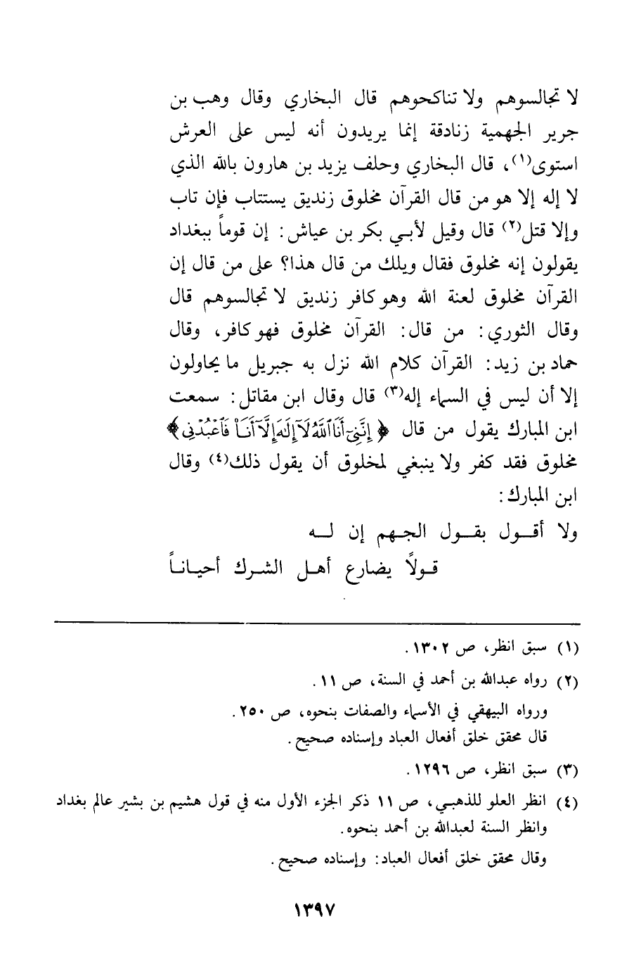 لا تجالسوهم ولا تناكحوهم قال البخاري وقال وهب بن جرير الجهمية زنادقة إنما يريدون أنه ليس على العرش استوى قال البخاري وحلف يزيد بن هارون بالله الذي لا إله إلا هو من قال القرآن مخلوق زنديق يستتاب فإن تاب وإلا قتل قال وقيل لأبي بكر بن عياش إن قوما ببغداد يقولون إنه مخلوق فقال ويلك من قال هذا على من قال إن القرآن مخلوق لعنة الله وهو كافر زنديق لا تجالسوهم قال وقال الثوري من قال القرآن مخلوق فهو كافر وقال حماد بن زيد القرآن كلام الله نزل به جبريل ما يحاولون إلا أن ليس في السماء إله قال وقال ابن مقاتل سمعت ابن المبارك يقول من قال {إِنَّنِي أَنَا اللَّهُ لا إِلَهَ إِلاَّ أَنَا فَاعْبُدْنِي} مخلوق فقد كفر ولا ينبغي لمخلوق أن يقول ذلك وقال ابن المبارك
