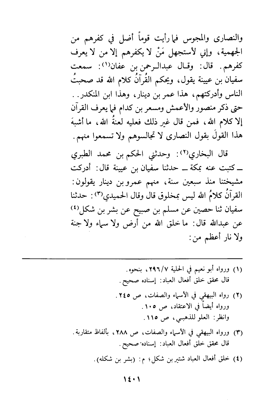 قال البخاري وحدثني الحكم بن محمد الطبري كتبت عنه بمكة حدثنا سفيان بن عيينة قال أدركت مشيختنا منذ سبعين سنة منهم عمرو بن دينار يقولون القرآن كلام الله ليس بمخلوق قال وقال الحميدي حدثنا سفيان ثنا حصين عن مسلم بن صبيح عن بشر بن شكل عن عبد الله قال ما خلق الله من أرض ولا سماء ولا جنة ولا نار أعظم من