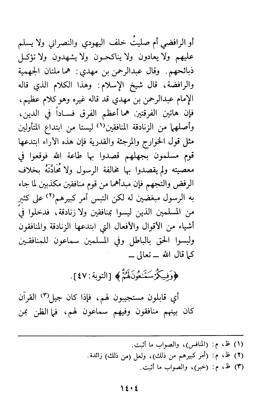 أو الرافضي أم صليت خلف اليهودي والنصراني ولا يسلم عليهم ولا يعادون ولا يناكحون ولا يشهدون ولا تؤكل ذبائحهم وقال عبد الرحمن بن مهدي هما ملتان الجهمية والرافضة قال شيخ الإسلام وهذا الكلام الذي قاله الإمام عبد الرحمن بن مهدي قد قاله غيره وهو كلام عظيم فإن هاتين الفرقتين هما أعظم الفرق فسادا في الدين وأصلهما من الزنادقة المنافقين ليستا من ابتداع المتأولين مثل قول الخوارج والمرجئة والقدرية فإن هذه الآراء ابتدعها قوم مسلمون بجهلهم قصدوا بها طاعة الله فوقعوا في معصيته ولم يقصدوا بها مخالفة الرسول ولا محادته بخلاف الرفض والتجهم فإن مبدأهما من قوم منافقين مكذبين لما جاء به الرسول مبغضين له لكن التبس أمر كثير منهم على كثير من المسلمين الذين ليسوا بمنافقين ولا زنادقة فدخلوا في أشياء من الأقوال والأفعال التي ابتدعها الزنادقة والمنافقون ولبسوا الحق بالباطل وفي المسلمين سماعون للمنافقين كما قال الله تعالى {وَفِيكُمْ سَمَّاعُونَ لَهُمْ} [التوبة47] أي قابلون مستجيبون لهم فإذا كان جيل القرآن كان بينهم منافقون وفيهم سماعون لهم فما الظن بمن