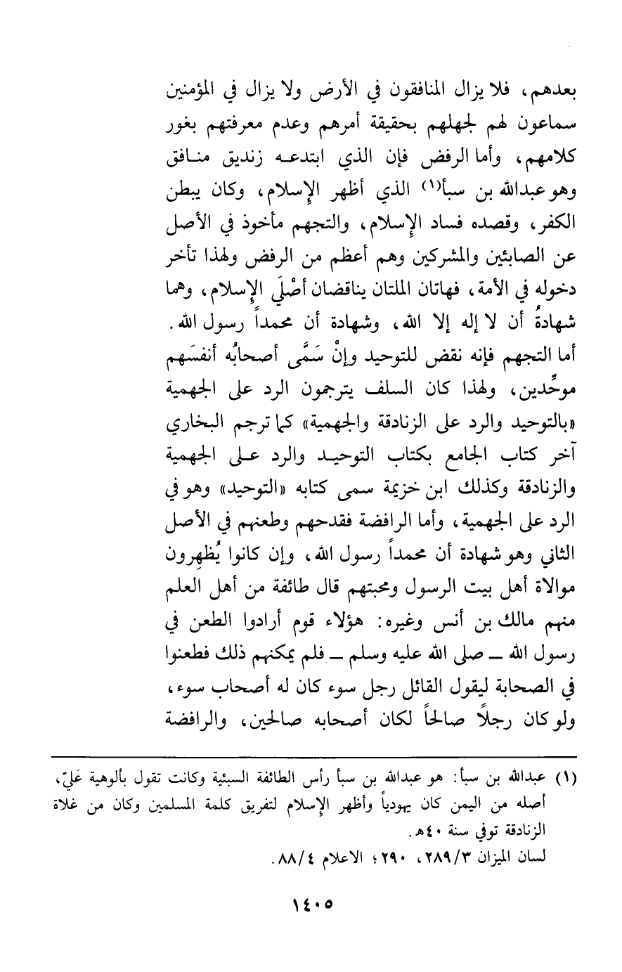 بعدهم فلا يزال المنافقون في الأرض ولا يزال في المؤمنين سماعون لهم لجهلهم بحقيقة أمرهم وعدم معرفتهم بغور كلامهم وأما الرفض فإن الذي ابتدعه زنديق منافق وهو عبد الله بن سبأ الذي أظهر الإسلام وكان يبطن الكفر وقصده فساد الإسلام والتجهم مأخوذ في الأصل عن الصابئين والمشركين وهم أعظم من الرفض ولهذا تأخر دخوله في الأمة فهاتان الملتان يناقضان أصلي الإسلام وهما شهادة أن لا إله إلا الله وشهادة أن محمدا رسول الله صلى الله عليه وسلم أما التجهم فإنه نقض التوحيد وإن سمى أصحابه أنفسهم موحدين ولهذا كان السلف يترجمون الرد على الجهمية بالتوحيد والرد على الزنادقة والجهمية كما ترجم البخاري آخر كتاب الجامع بكتاب التوحيد والرد على الجهمية والزنادقة وكذلك ابن خزيمة سمى كتابه التوحيد وهو في الرد على الجهمية وأما الرافضة فقدحهم وطعنهم في الأصل الثاني وهو شهادة أن محمدا رسول الله صلى الله عليه وسلم وإن كانوا يظهرون موالاة أهل بيت الرسول ومحبتهم قال طائفة من أهل العلم منهم مالك بن أنس وغيره هؤلاء قوم أرادوا الطعن في رسول الله صلى الله عليه وسلم فلم يمكنهم ذلك فطعنوا في الصحابة ليقول القائل رجل سوء كان له أصحاب سوء ولو كان رجلا صالحا لكان أصحابه صالحين والرافضة