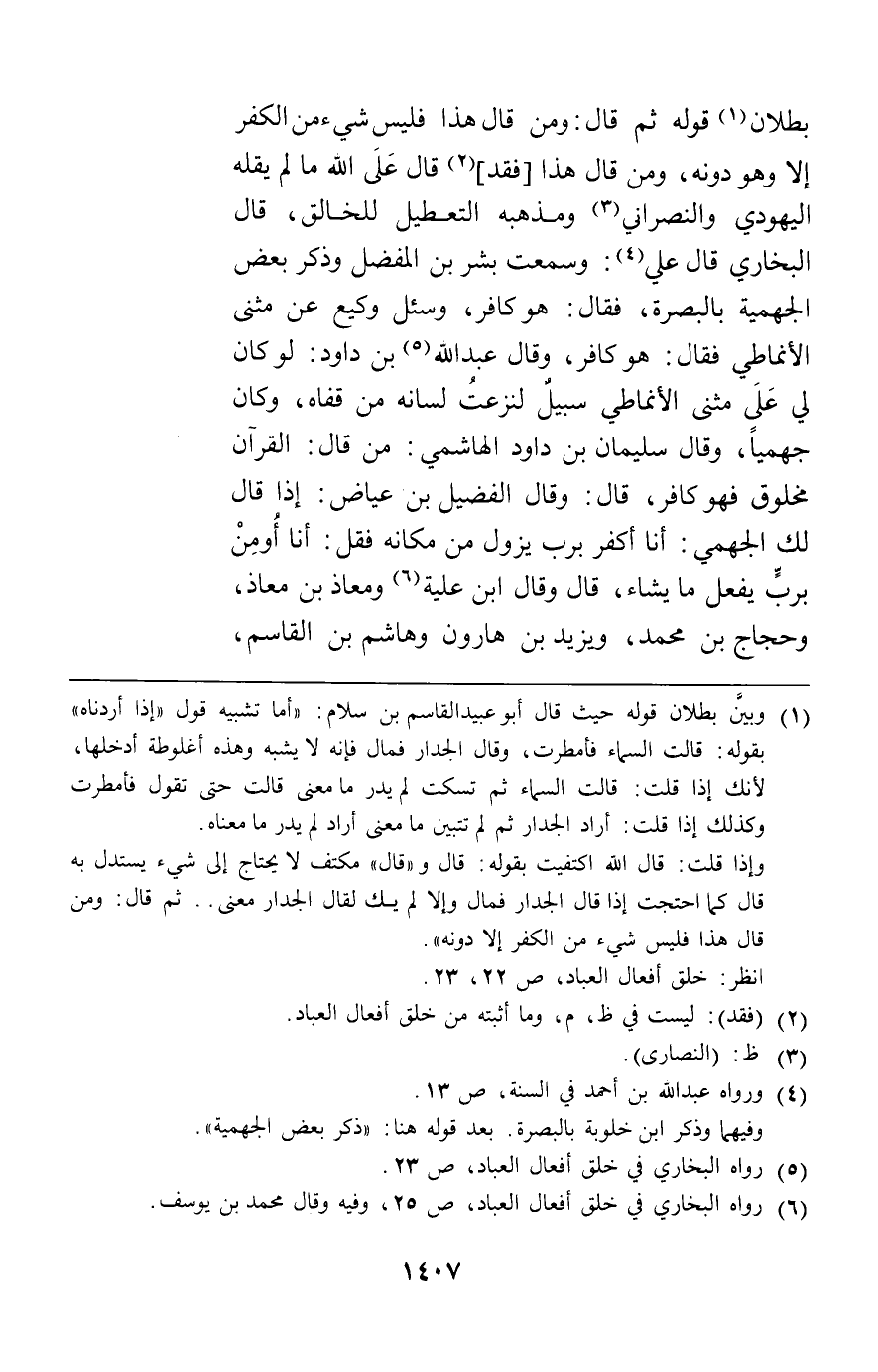 بطلان قوله ثم قال ومن قال هذا فليس شيء من الكفر إلا وهو دونه ومن قال هذا فقد قال على الله مالم يقله اليهودي والنصراني ومذهبه التعطيل للخالق قال البخاري قال علي وسمعت بشر بن المفضل وذكر بعض الجهمية بالبصرة فقال هو كافر وسئل وكيع عن مثنى الأنماطي فقال هو كافر وقال عبد الله بن داود لو كان لي على مثنى الأنماطي سبيل لنزعت لسانه من قفاه وكان جهميا وقال سليمان بن داود الهاشمي من قال القرآن مخلوق فهو كافر قال وقال الفضيل بن عياض إذا قال لك الجهمي أنا أكفر برب يزول من مكانه فقل أنا أؤمن برب يفعل ما يشاء قال وقال ابن علية ومعاذ بن معاذ وحجاج بن محمد ويزيد بن هارون وهاشم بن القاسم