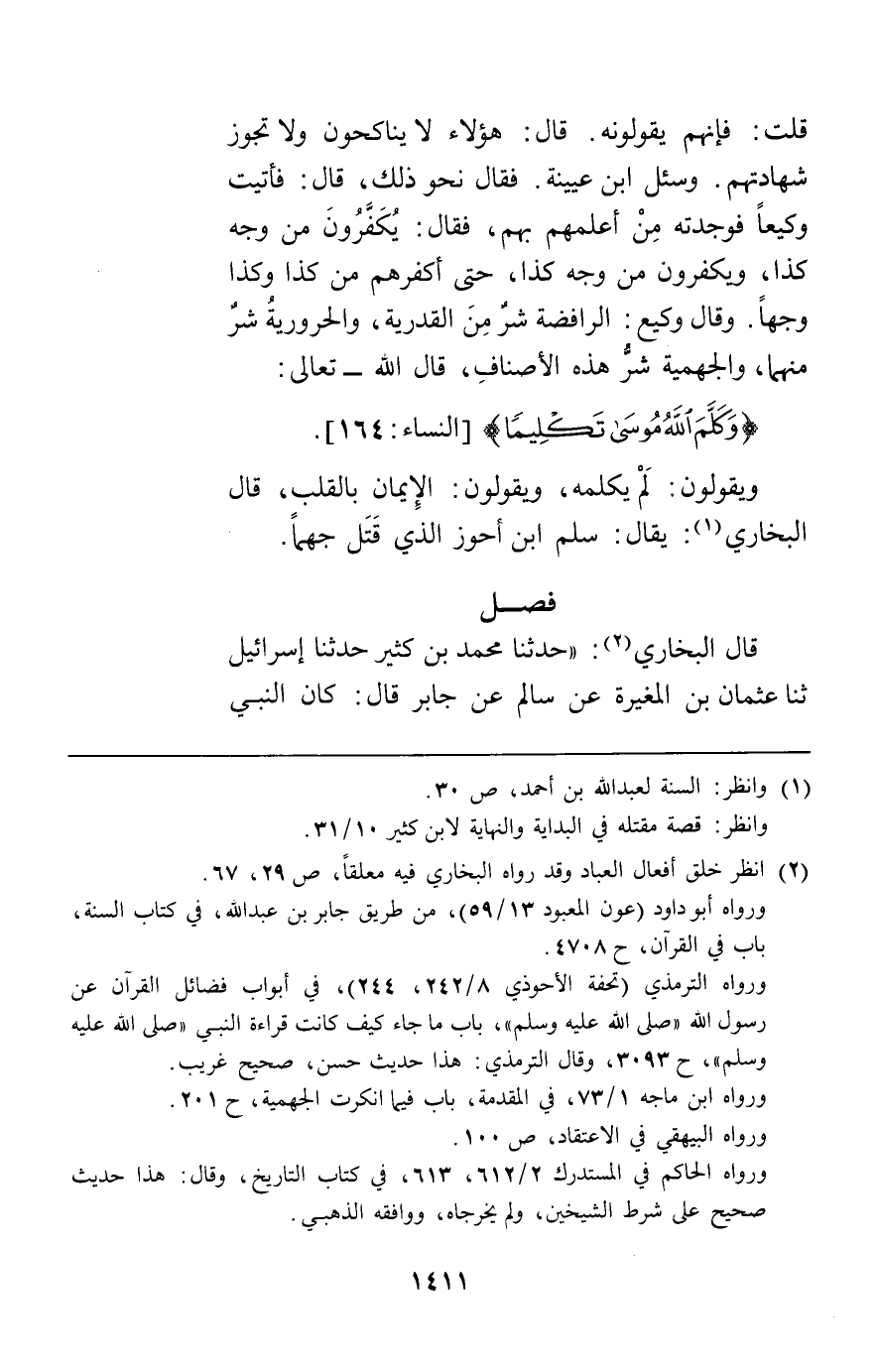قلت فإنهم يقولونه قال هؤلاء لا يناكحون ولا تجوز شهادتهم وسئل ابن عيينة فقال نحو ذلك قال فأتيت وكيعا فوجدته من أعلمهم بهم فقال يكفرون من وجه كذا ويكفرون من وجه كذا حتى أكفرهم من كذا وكذا وجها وقال وكيع الرافضة شر من القدرية والحرورية شر منهما والجهمية شر هذه الأصناف قال الله تعالى {وَكَلَّمَ اللَّهُ مُوسَى تَكْلِيماً} [النساء164] ويقولون لم يكلمه ويقولون الإيمان بالقلب قال البخاري يقال سلم ابن أحوز الذي قتل جهما.