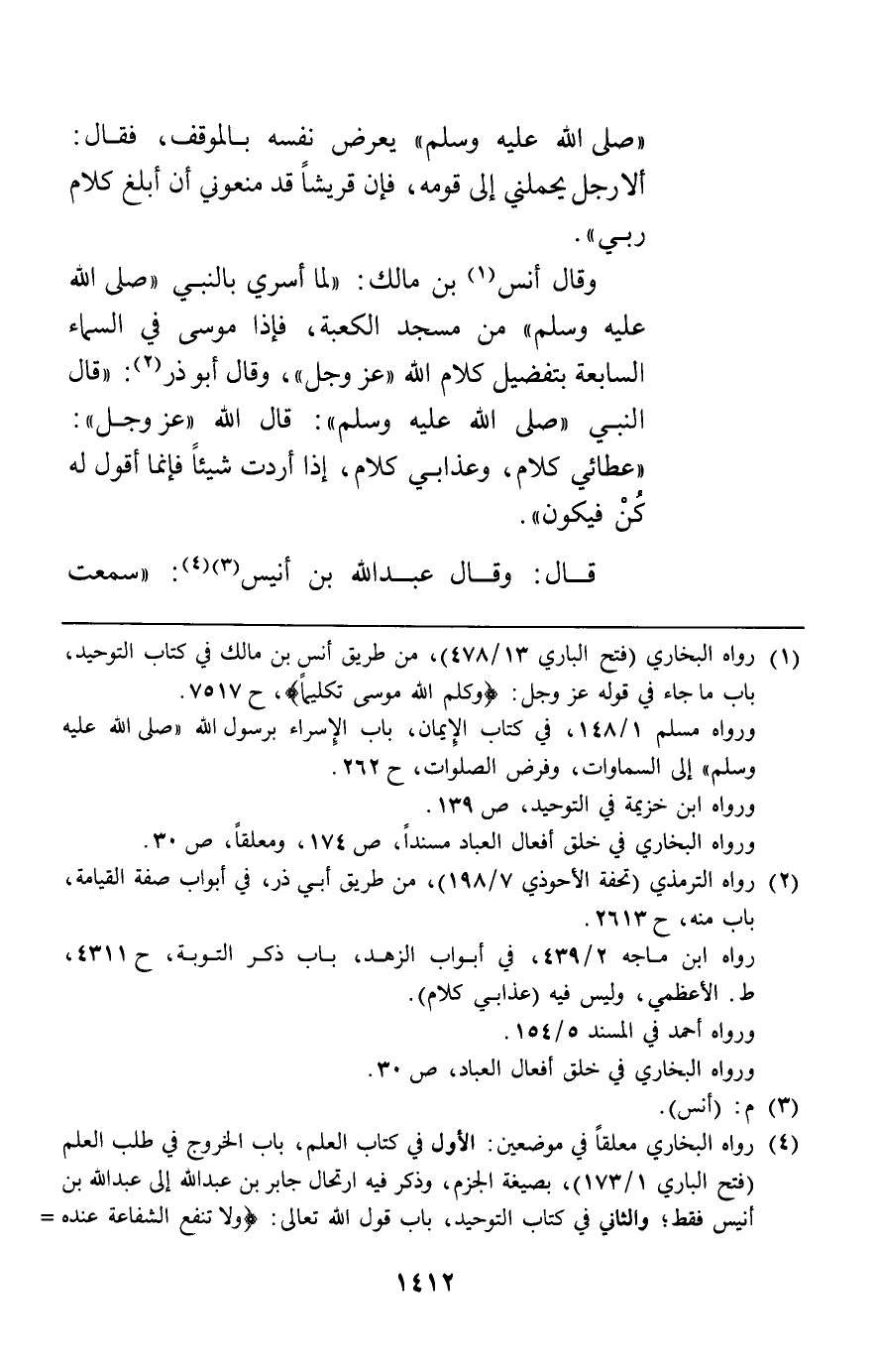 وقال أنس بن مالك لما أسري بالنبي من مسجد الكعبة فإذا موسى في السماء السابعة بتفضيل كلام الله عز وجل وقال أبو ذر قال النبي صلى الله عليه وسلم: " قال الله عز وجل عطائي كلام وعذابي كلام إذا أردت شيئا فإنما أقول له كن فيكون".