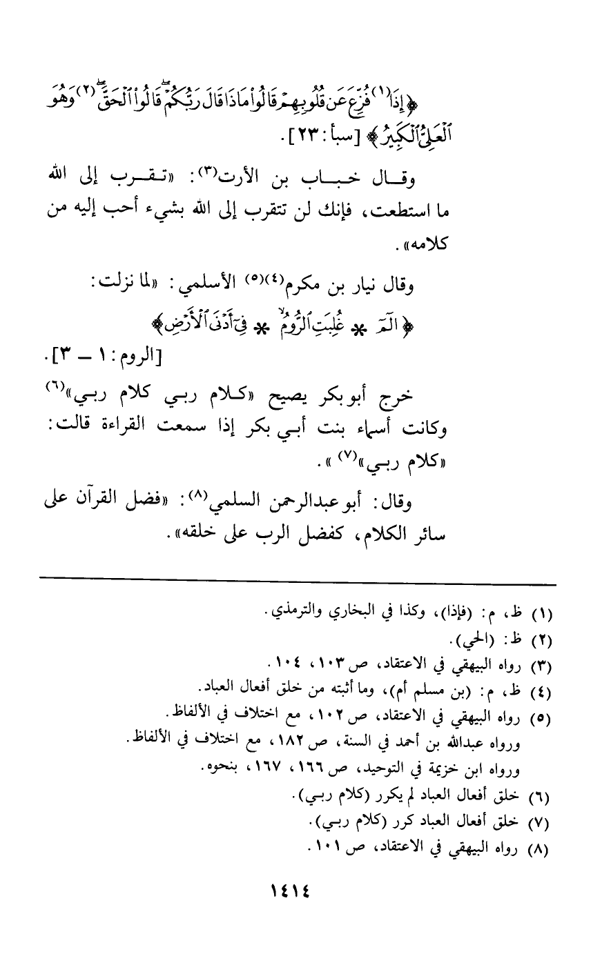 {إِذَا فُزِّعَ عَنْ قُلُوبِهِمْ قَالُوا مَاذَا قَالَ رَبُّكُمْ قَالُوا الْحَقَّ وَهُوَ الْعَلِيُّ الْكَبِيرُ} [سبأ23] وقال خباب بن الأرت تقرب إلى الله ما استطعت فإنك لن تتقرب إلى الله بشيء أحب إليه من كلامه.
