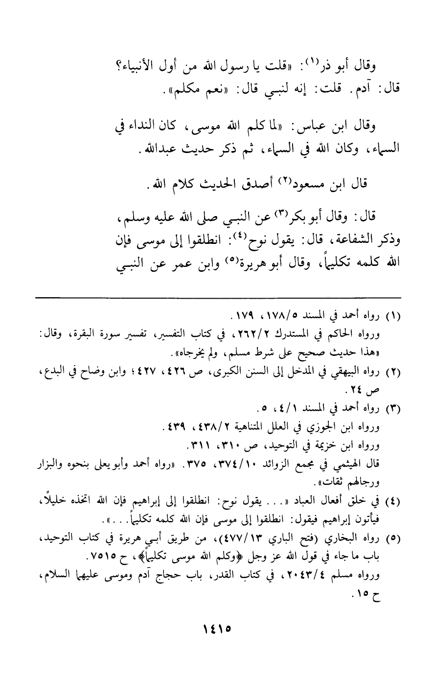 قال ابن مسعود أصدق الحديث كلام الله. قال وقال أبو بكر عن النبي وذكر الشفاعة قال يقول نوح انطلقوا إلى موسى فإن الله كلمه تكليما وقال أبو هريرة وابن عمر عن النبي